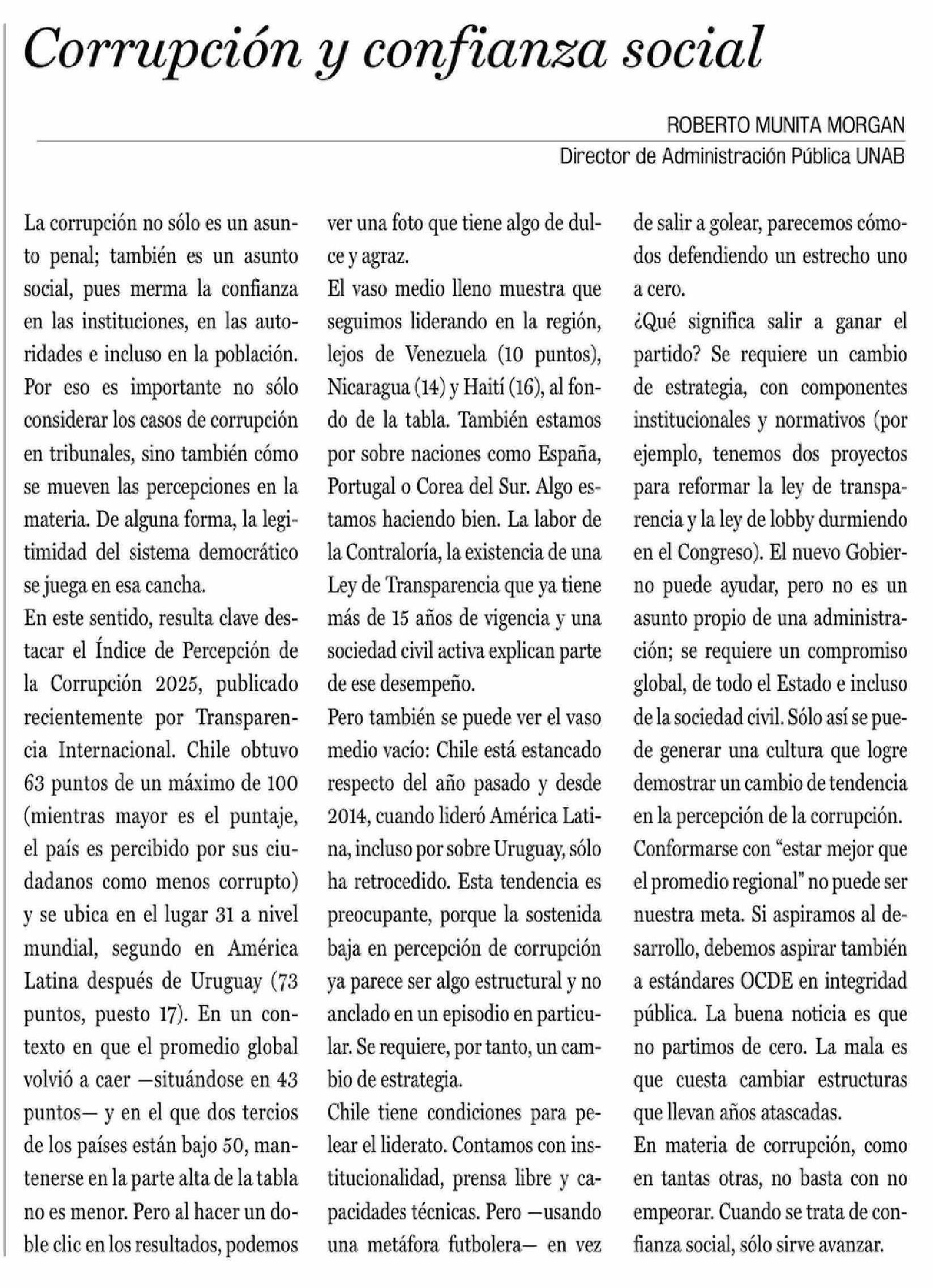 Columnas de Opinión: Corrupción y confianza social 04-03-2026 La Prensa de Curicó |