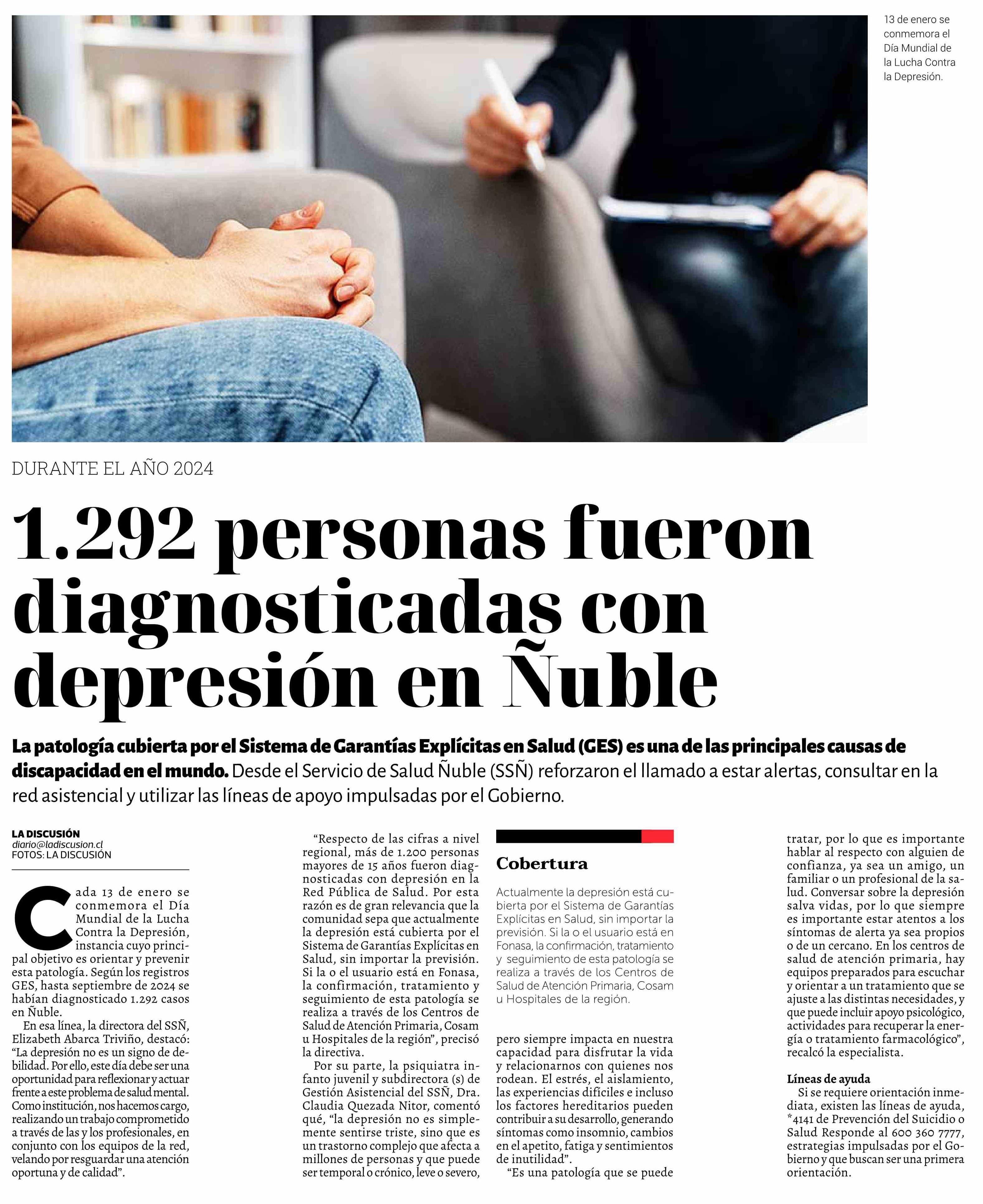 1.292 Personas fueron diagnosticadas con depresión en Ñuble 16-01-2025 La Discusión |