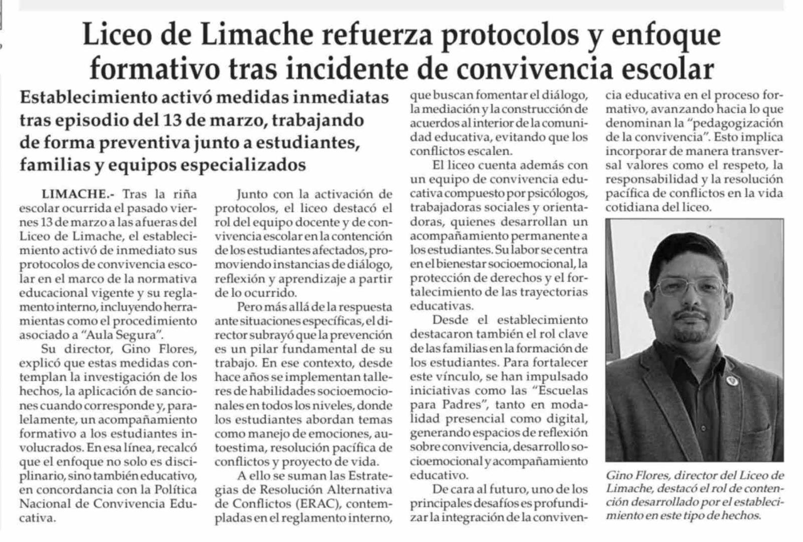 Título: Liceo de Limache refuerza protocolos y enfoque formativo tras incidente de convivencia escolar