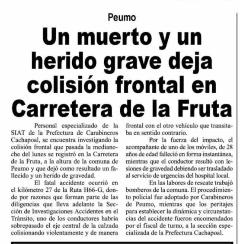 Título: Un muerto y un herido grave deja colisión frontal en Carretera de la Fruta