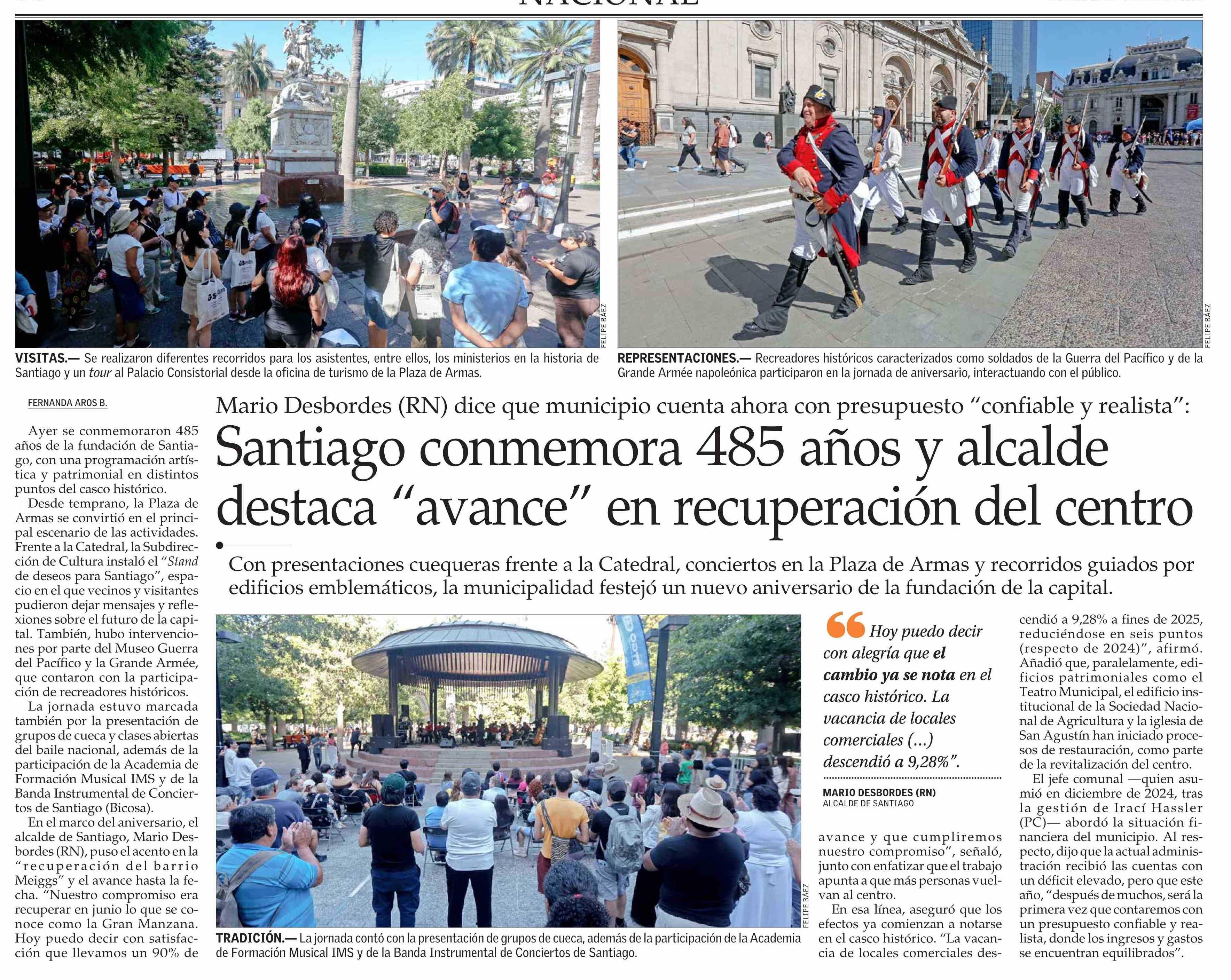Santiago conmemora 485 años y alcalde destaca “avance” en recuperación del centro 13-02-2026 El Mercurio |