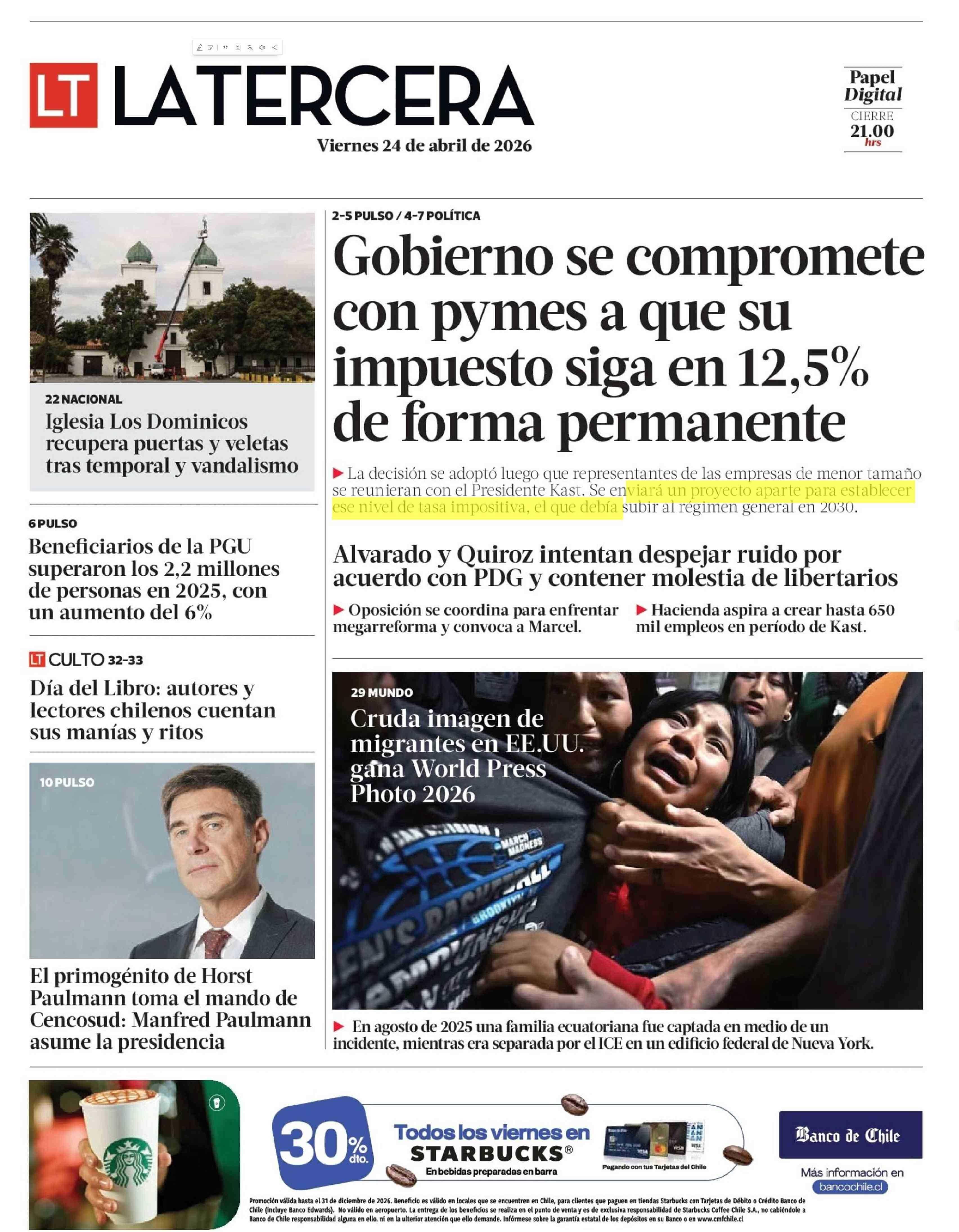 PORTADA LA TERCERA SEGUNDA EDICIÓN - CHILE 24-04-2026 La Tercera |