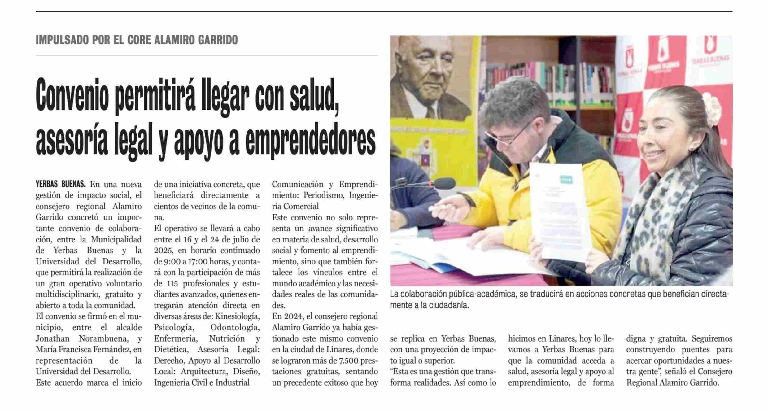 Convenio permitirá llegar con salud, asesoría legal y apoyo a emprendedores 17-06-2025 La Prensa de Curicó |