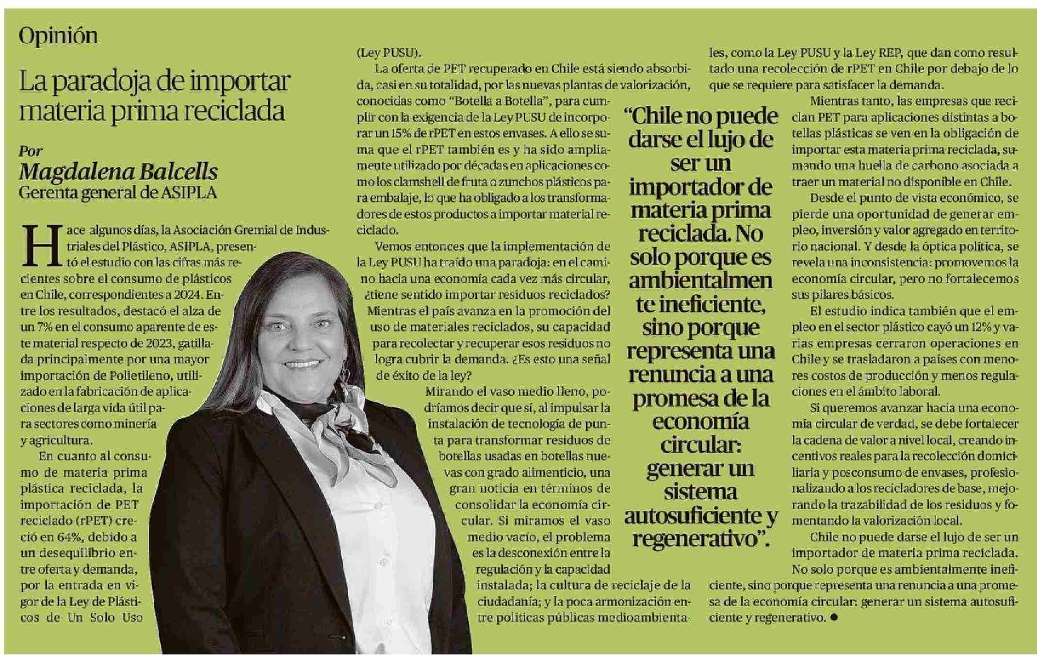 COLUMNAS DE OPINIÓN: La paradoja de importar materia prima reciclada 22-06-2025 El Mercurio de Valparaíso |