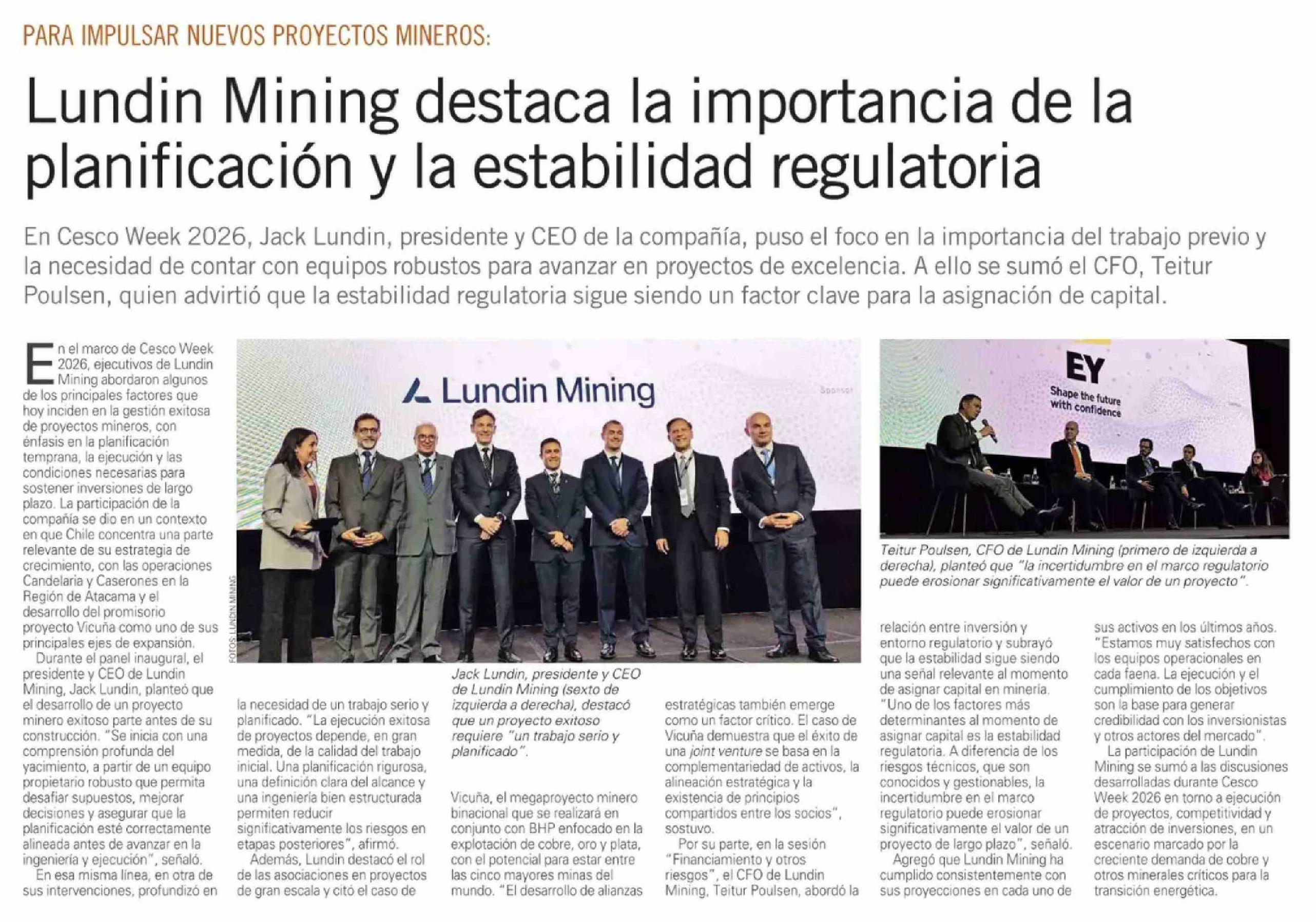 Lundin Mining destaca la importancia de la planificación y la estabilidad regulatoria 22-04-2026 El Mercurio |