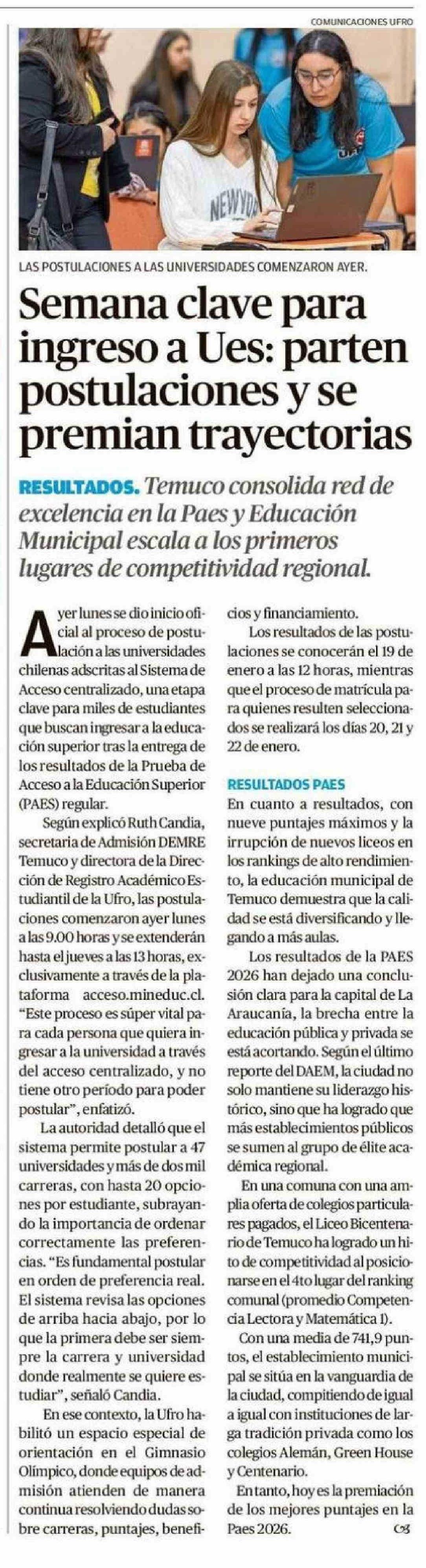 Semana clave para ingreso a Ues: parten postulaciones y se premian trayectorias 06-01-2026 El Austral de la Araucanía |