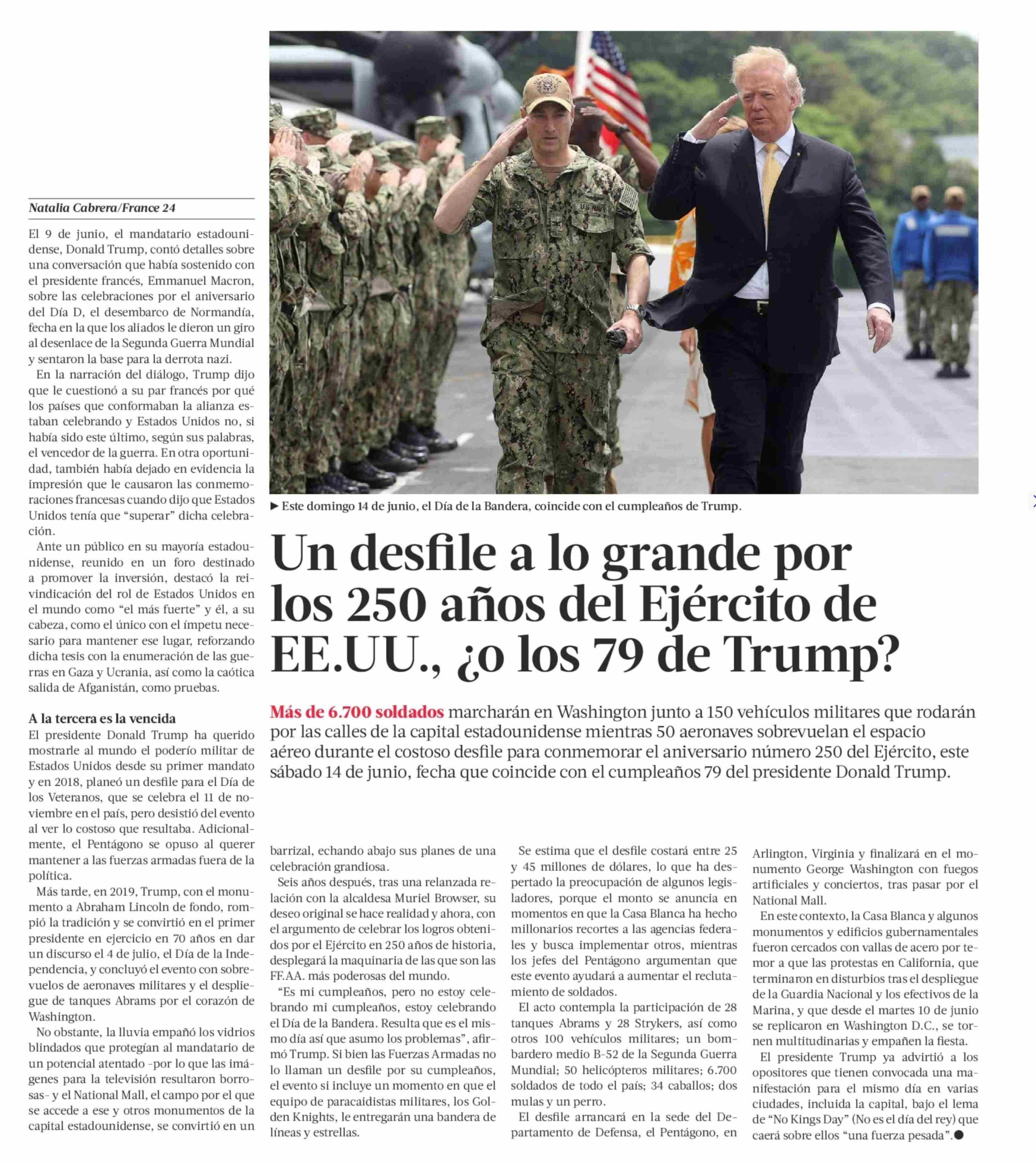 Un desfile a lo grande por los 250 años del Ejército de EE.UU., ¿o los 79 de Trump? 13-06-2025 La Tercera |