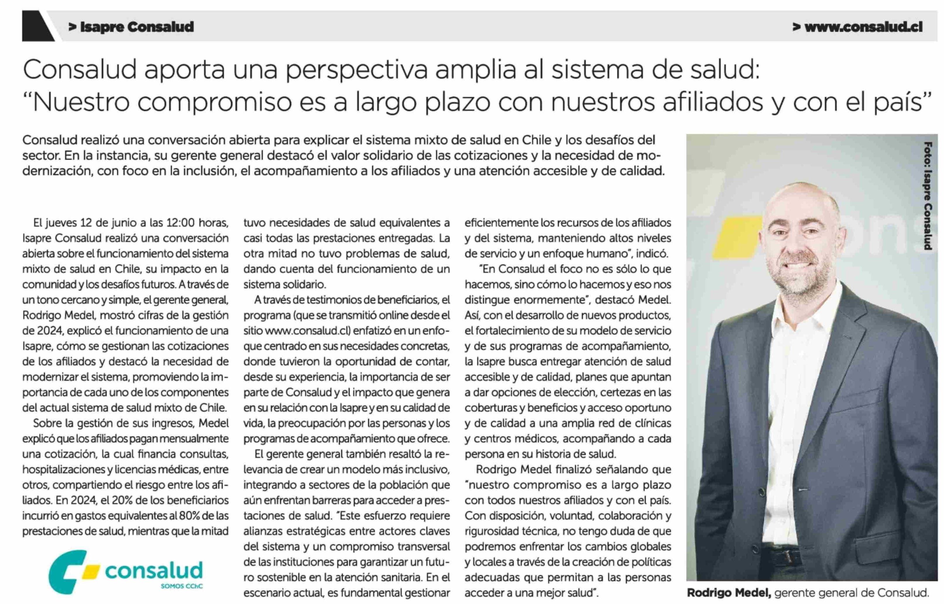 Título: Consalud aporta una perspectiva amplia al sistema de salud: “Nuestro compromiso es a largo plazo con nuestros afiliados y con el país”