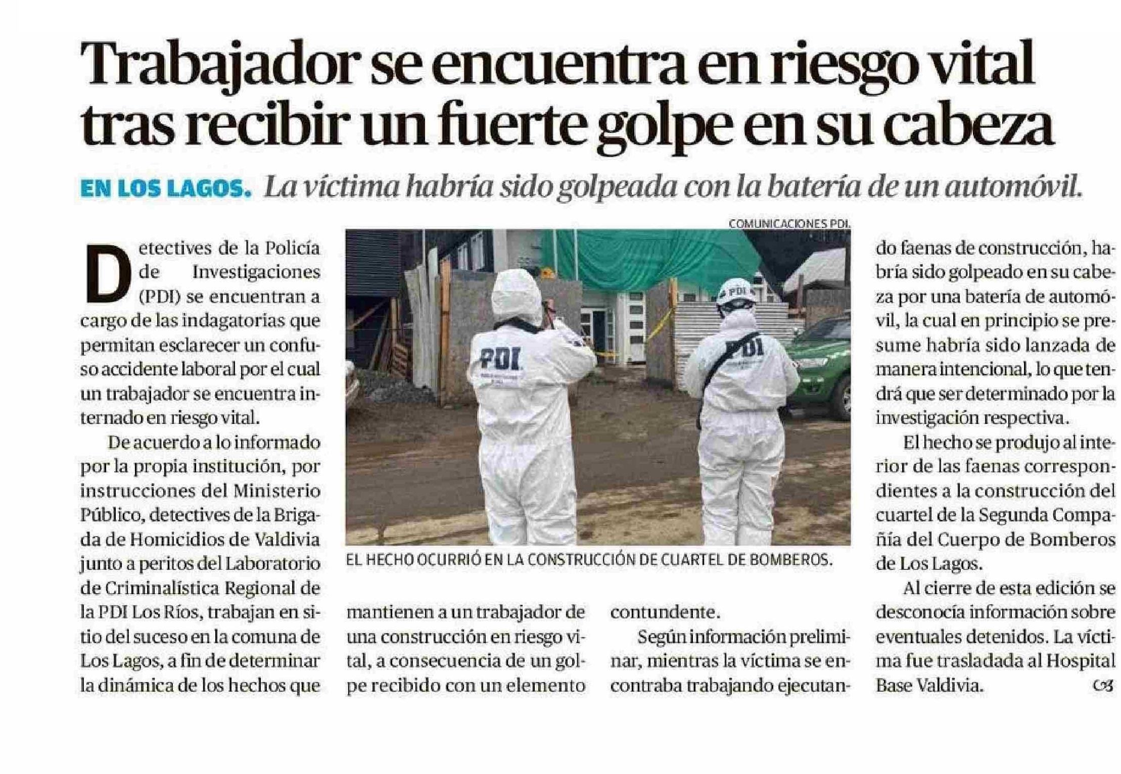Trabajador se encuentra en riesgo vital tras recibir un fuerte golpe en su cabeza 17-06-2025 Diario Austral Región de Los Ríos |