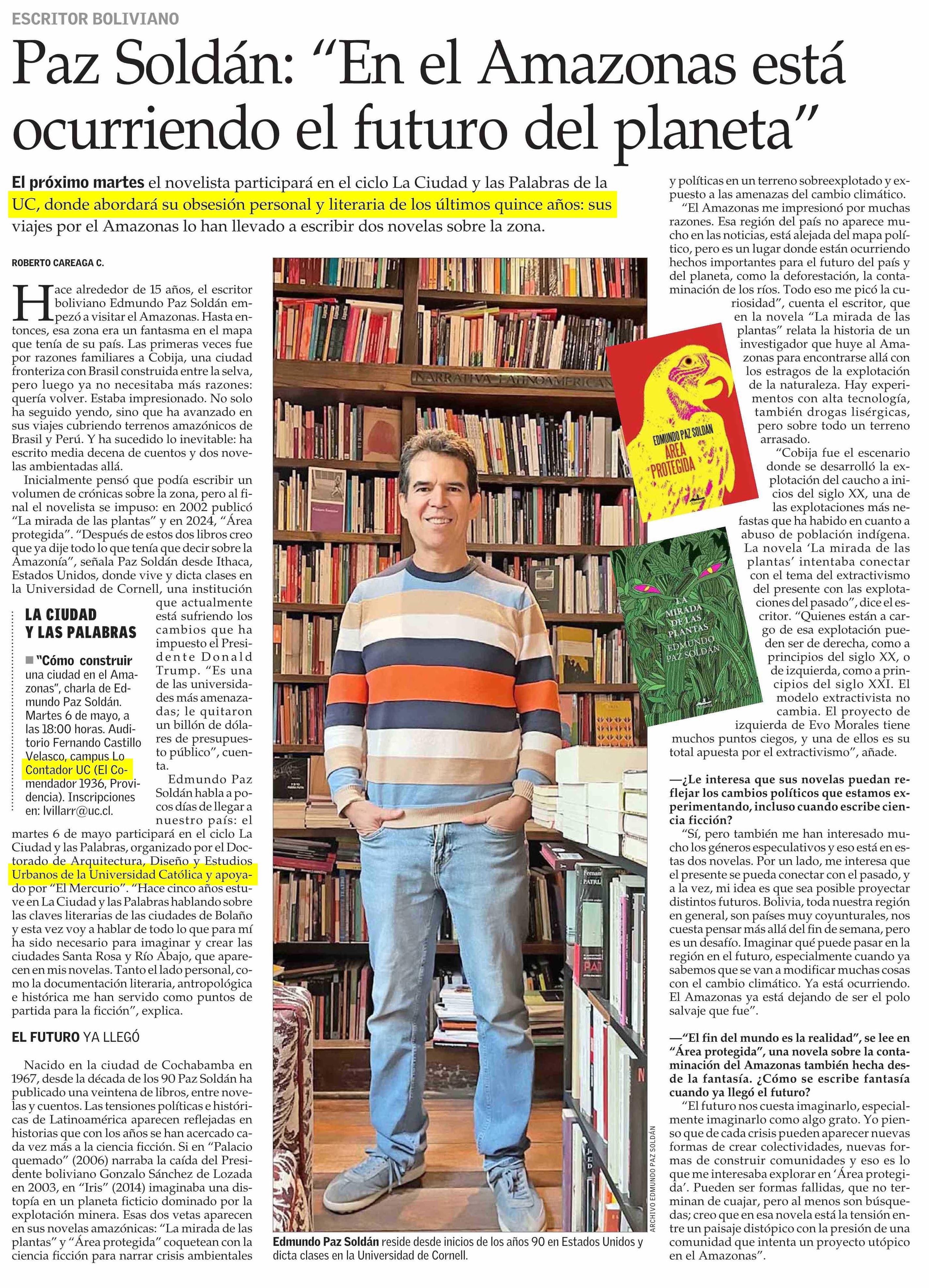 Paz Soldán: “En el Amazonas está ocurriendo el futuro del planeta” 03-05-2025 El Mercurio |