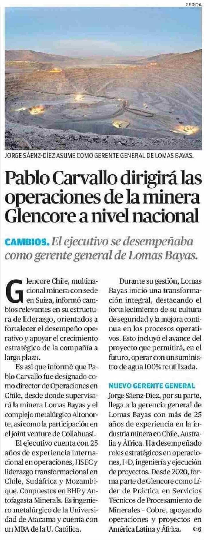 Pablo Carvallo dirigirá las operaciones de la minera Glencore a nivel nacional 06-06-2025 El Mercurio de Antofagasta |