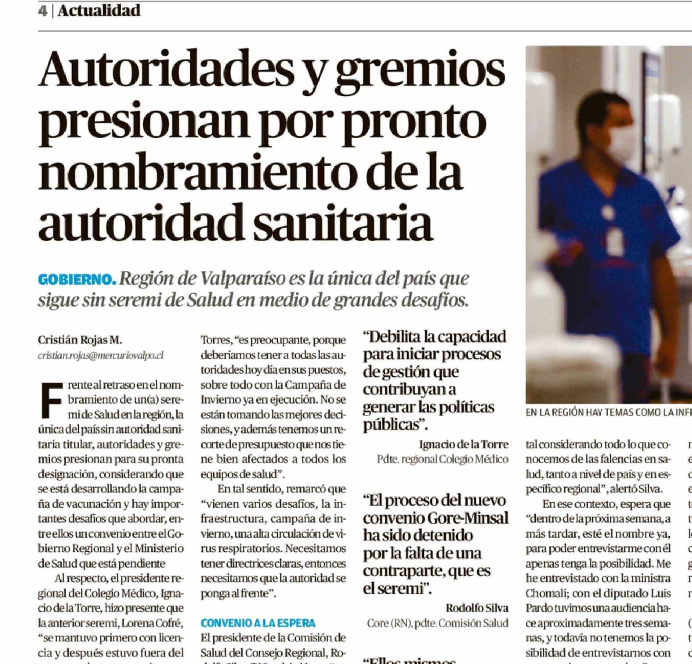Autoridades y gremios presionan por pronto nombramiento de la autoridad sanitaria 02-04-2026 El Mercurio de Valparaíso |