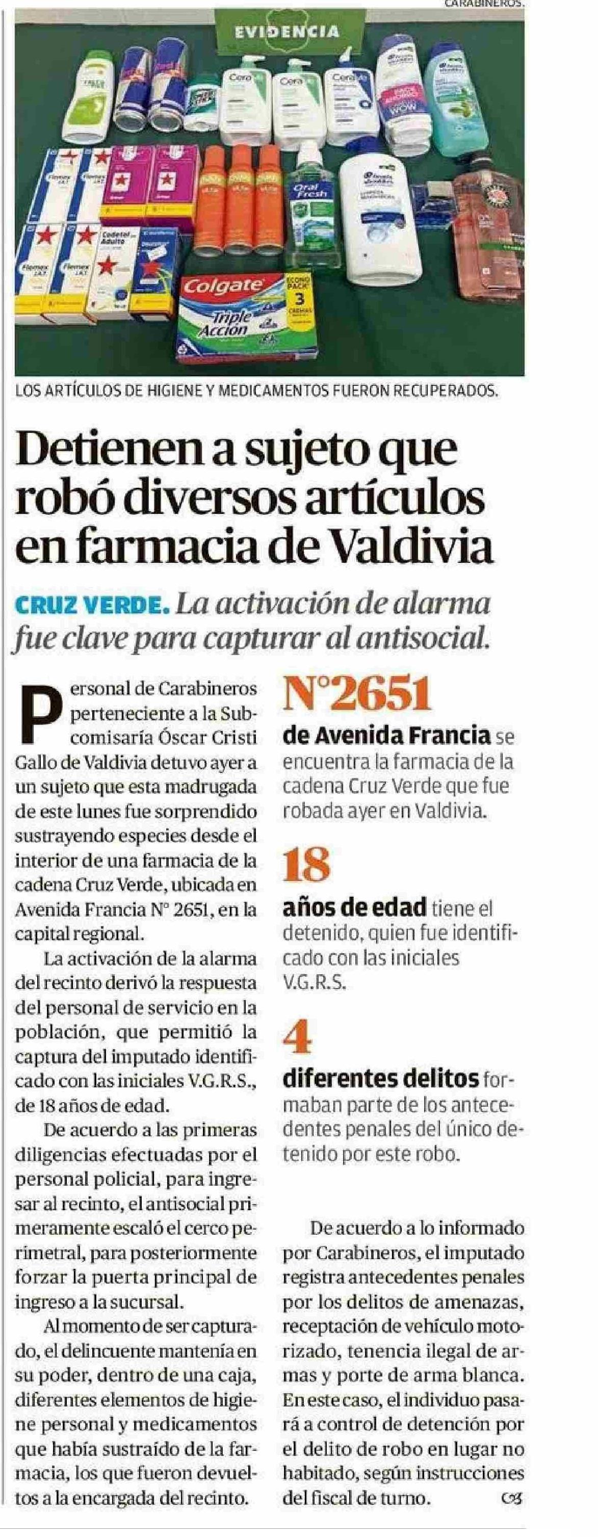 Título: Detienen a sujeto que robó diversos artículos en farmacia de Valdivia