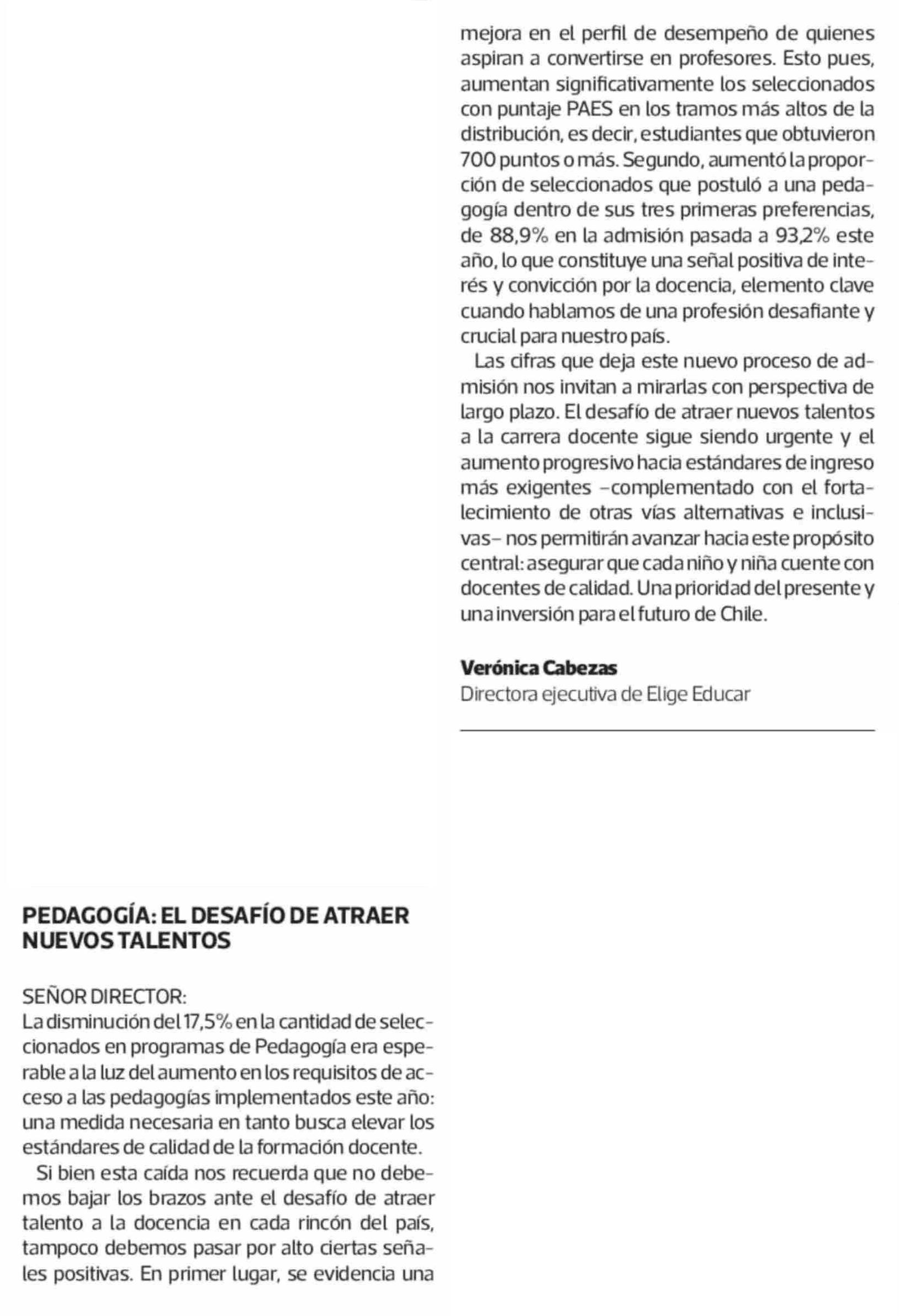 Cartas: PEDAGOGÍA: EL DESAFÍO DE ATRAER NUEVOS TALENTOS 22-01-2026 La Tercera |