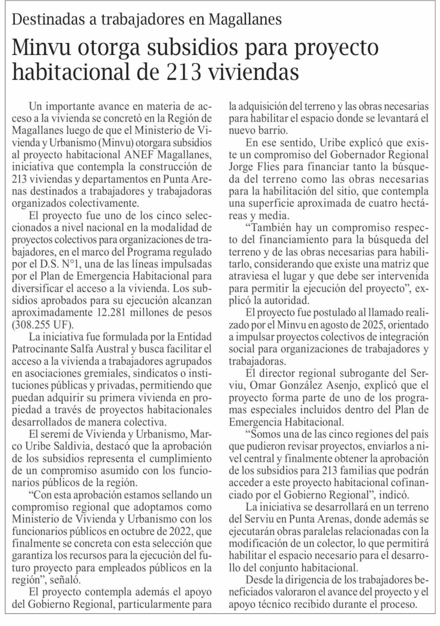 Minvu otorga subsidios para proyecto habitacional de 213 viviendas 11-03-2026 El Pingüino |
