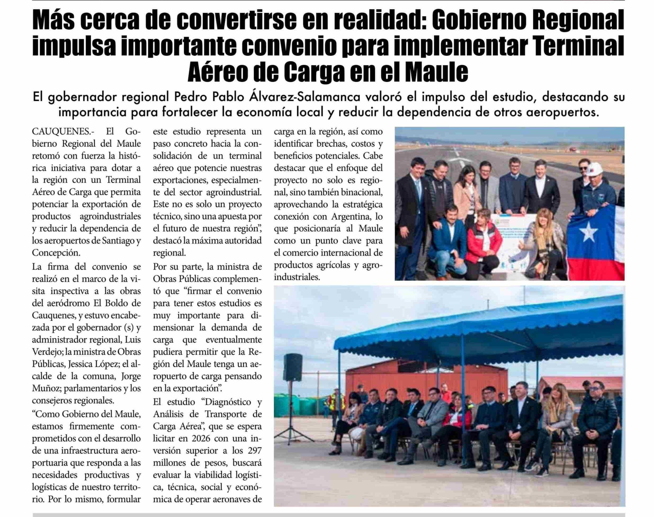 | Título: | Más cerca de convertirse en realidad: Gobierno Regional impulsa importante convenio para implementar Terminal Aéreo de Carga en el Maule |