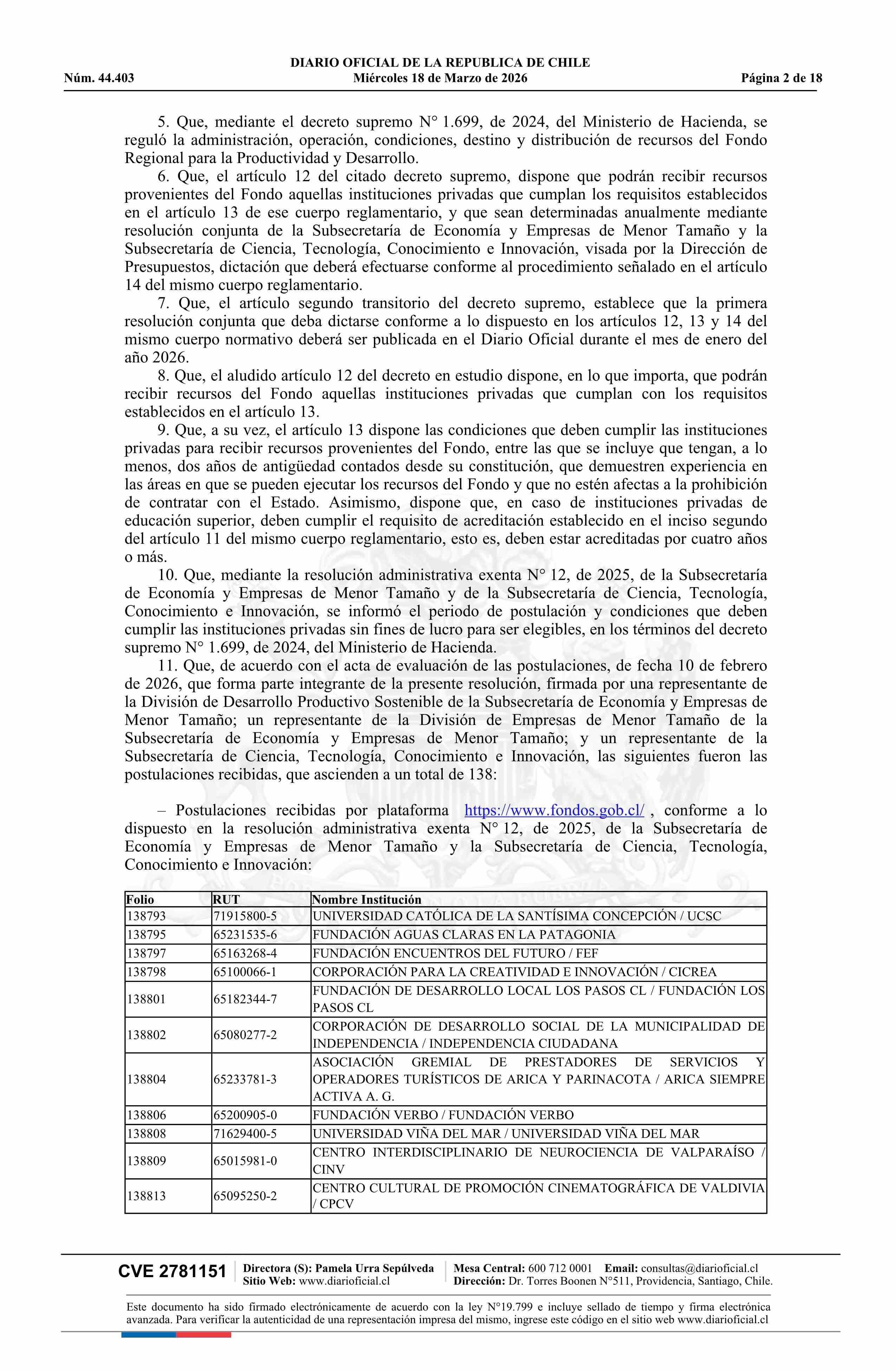 Título: Resolución exenta número 1, de 2026.- Determina las instituciones privadas sin fines de lucro que cumplen con los requisitos para recibir recursos provenientes del Fondo Regional para la Productividad y el Desarrollo, regulado por el decreto N° 1.699, de 2024, del Ministerio de Hacienda, Primer Llam