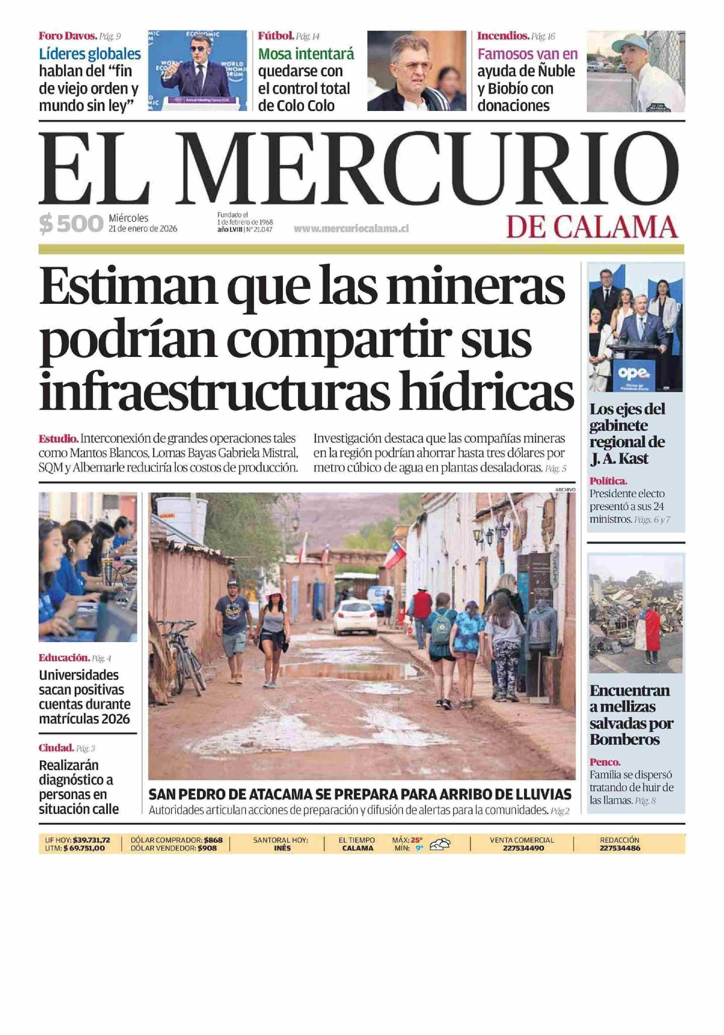 PORTADA EL MERCURIO DE CALAMA CHILE 21-01-2026 El Mercurio de Calama |