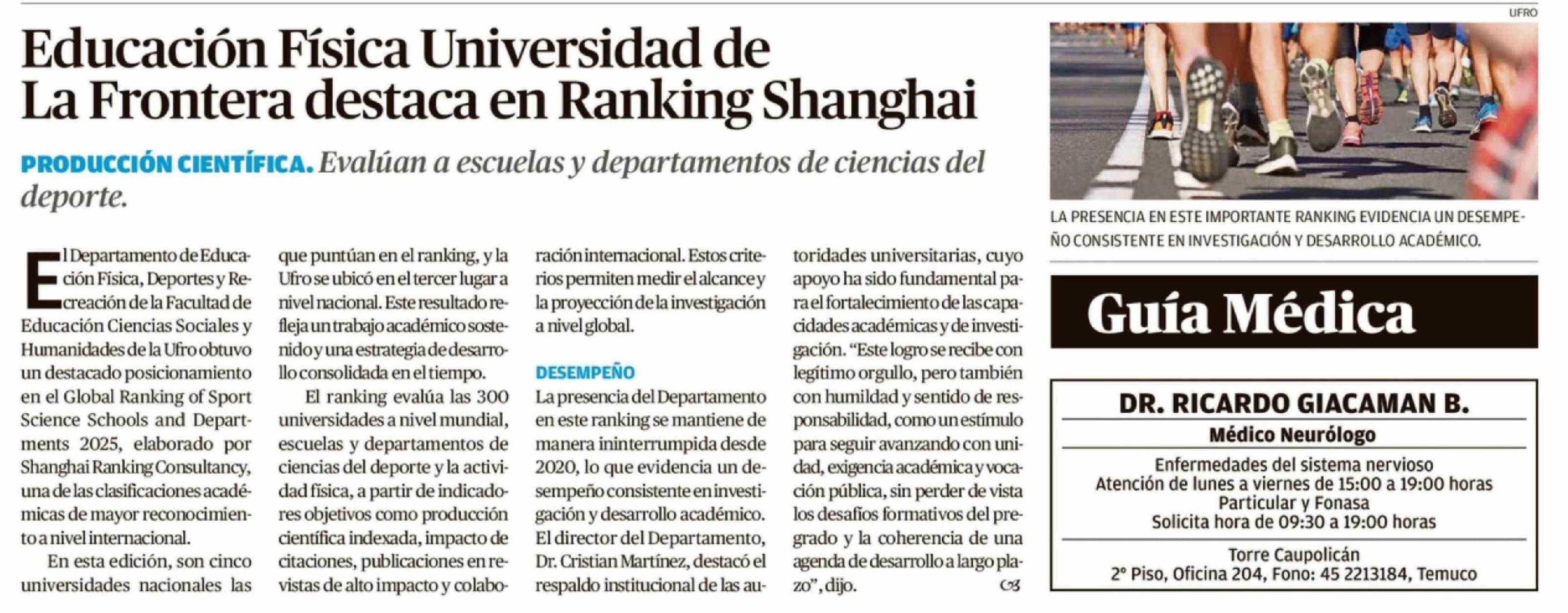 Educación Física Universidad de La Frontera destaca en Ranking Shanghai 10-02-2026 El Austral de la Araucanía |