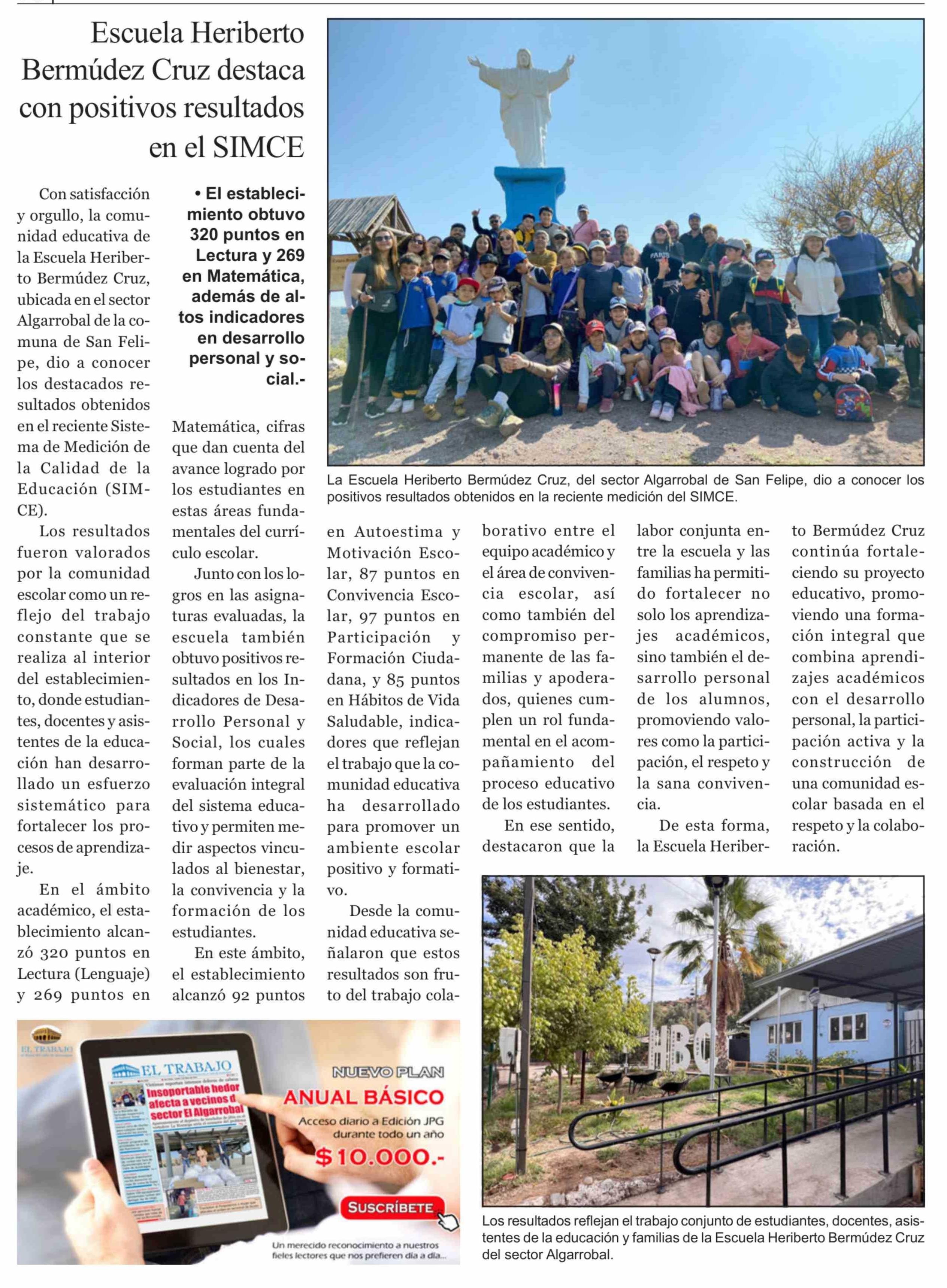Escuela Heriberto Bermúdez Cruz destaca con positivos resultados en el SIMCE 10-03-2026 El Trabajo |