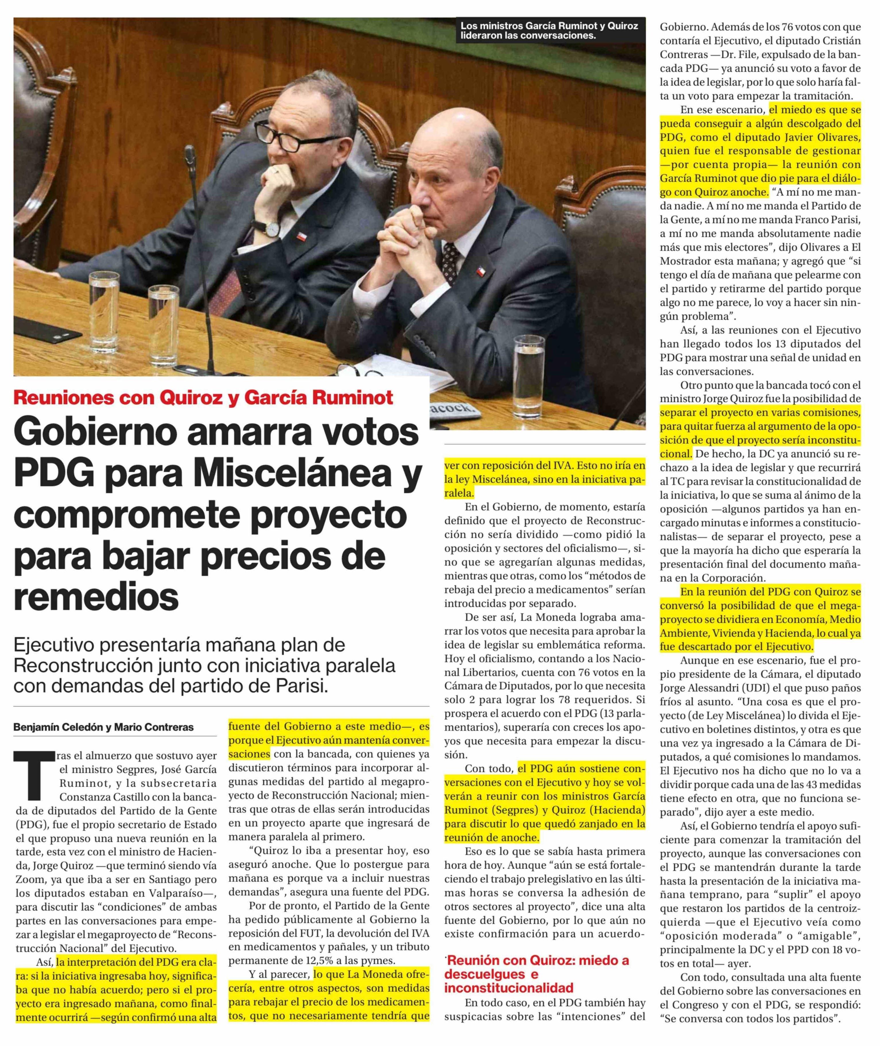 Gobierno amarra votos PDG para Miscelánea y compromete proyecto para bajar precios de remedios 21-04-2026 La Segunda |
