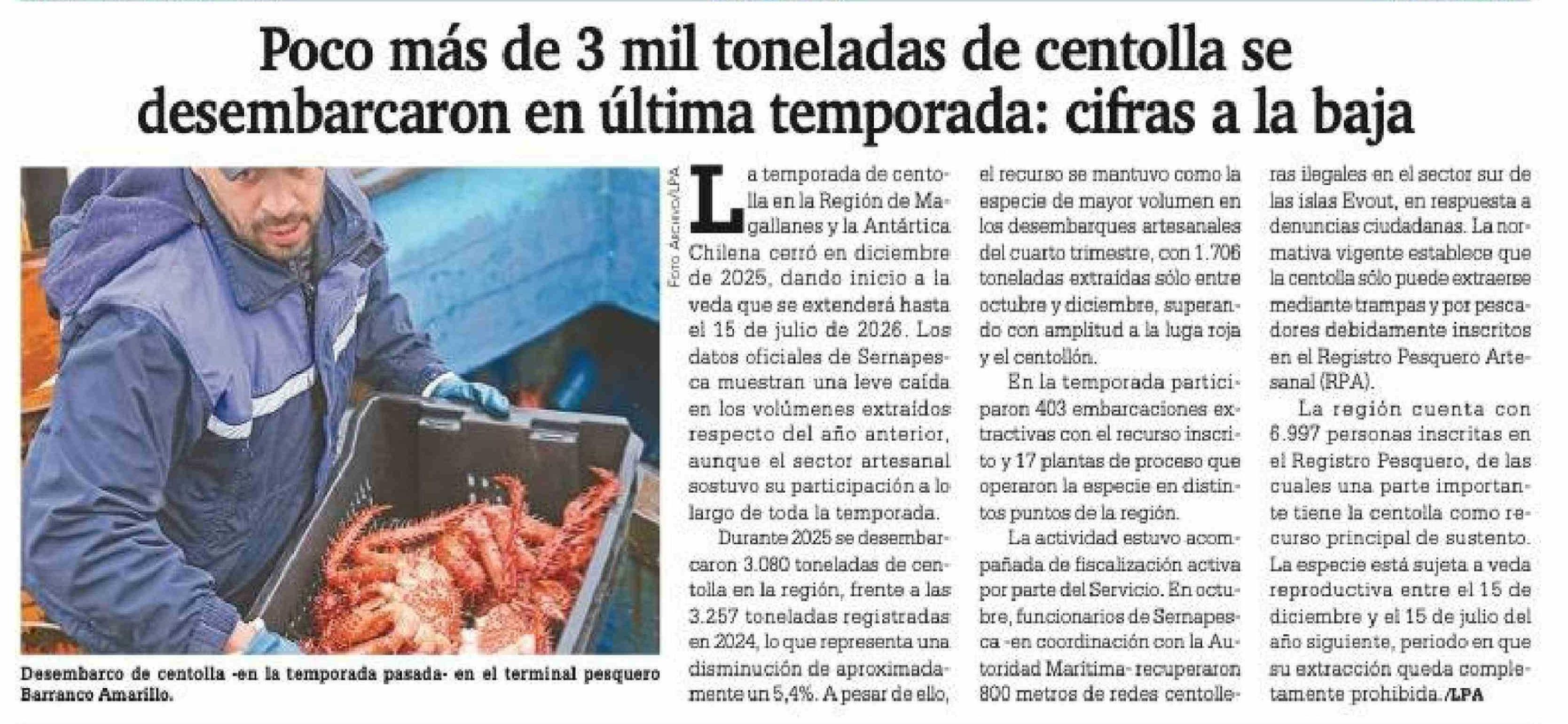 Poco más de 3 mil toneladas de centolla se desembarcaron en última temporada: cifras a la baja 17-03-2026 La Prensa Austral |