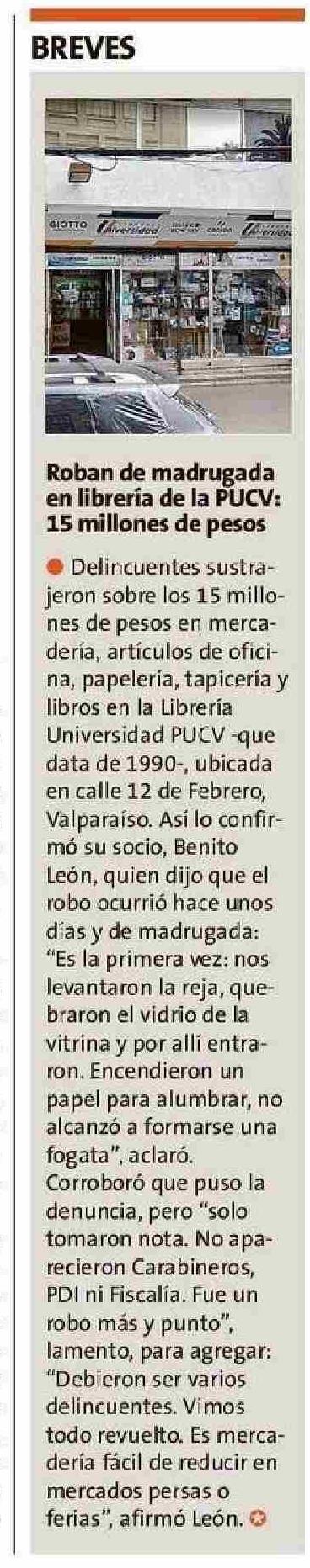 | Título: | Roban de madrugada en librería de la PUCV: 15 millones de pesos |