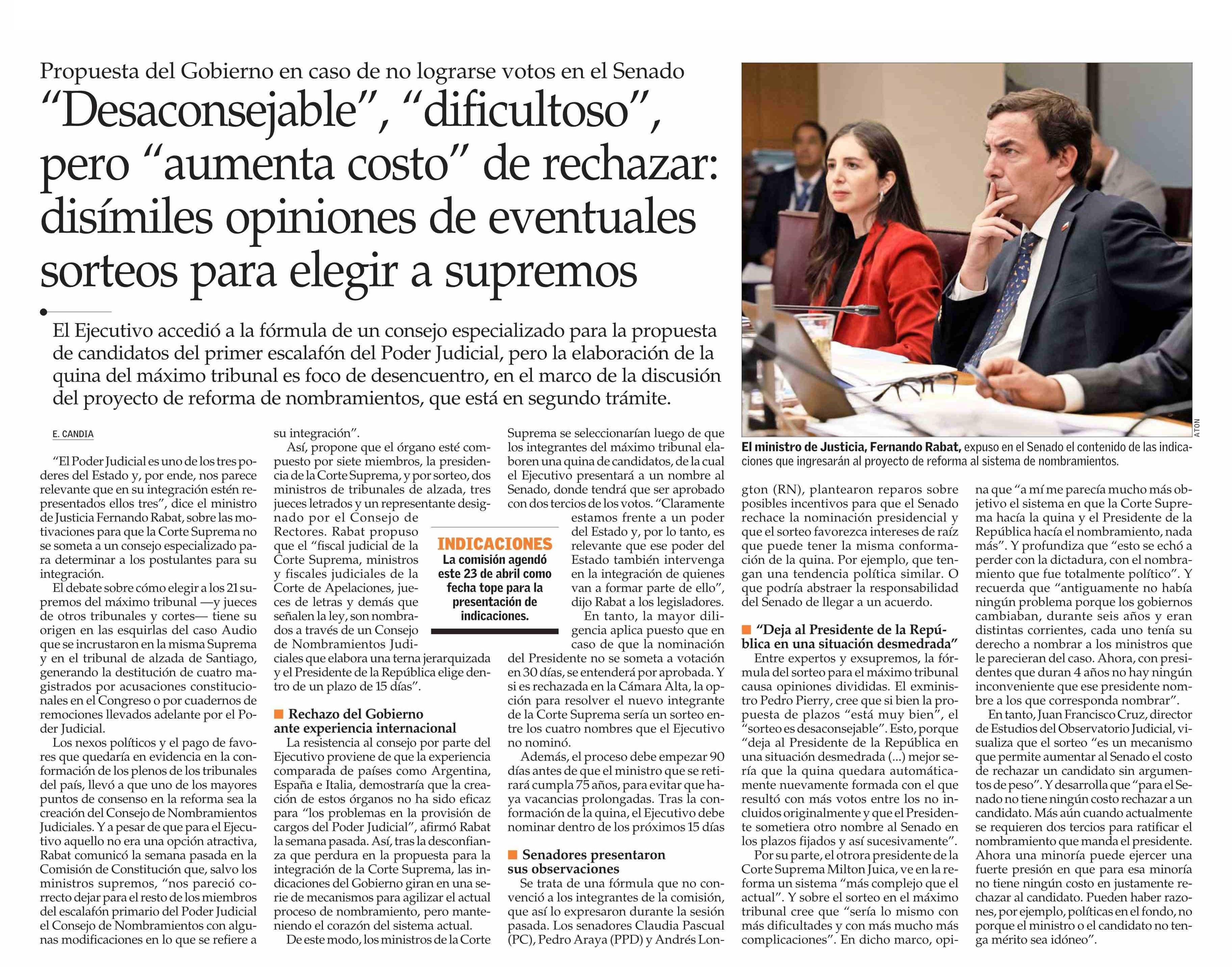 “Desaconsejable”, “dificultoso”, pero “aumenta costo” de rechazar: disímiles opiniones de eventuales sorteos para elegir a supremos 21-04-2026 El Mercurio |