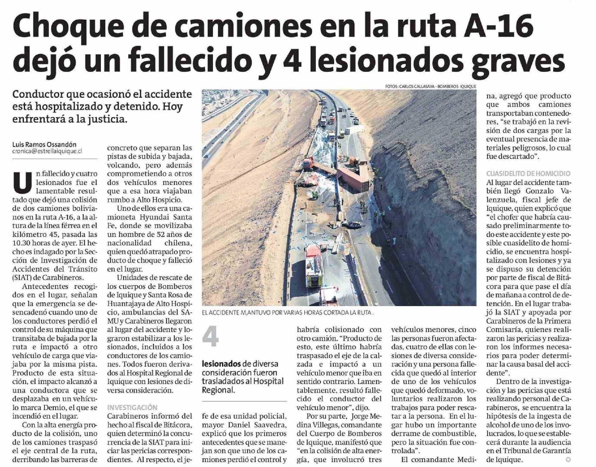 Choque de camiones en la ruta A-16 dejó un fallecido y 4 lesionados graves 23-03-2025 La Estrella de Iquique |