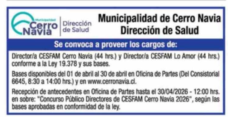 | Título: | Extractos: Municipalidad de Cerro Navia Dirección de Salud Dirección de Salud Cerro Navia Se convoca a proveer los cargos de: Director/a CESFAM Cerro Navia (44 hrs.) y Director/a CESFAM Lo Amor (44 hrs.) conforme a la Ley 19.378 y sus bases. Bases disponibles del 01 de abril al 30 de abril en Oficin |