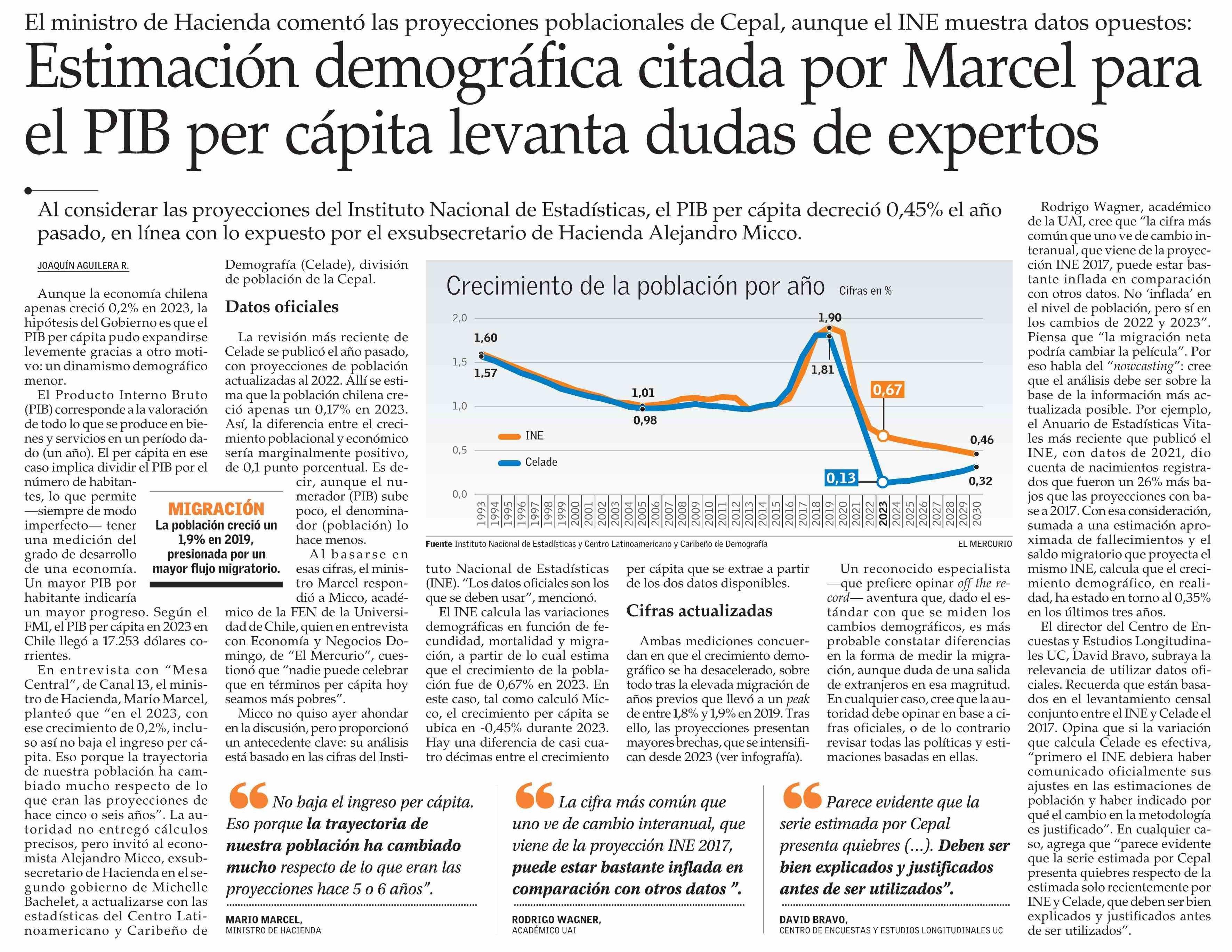Estimación demográfica citada por Marcel para el PIB per cápita levanta dudas de expertos 26-03-2024 El Mercurio |