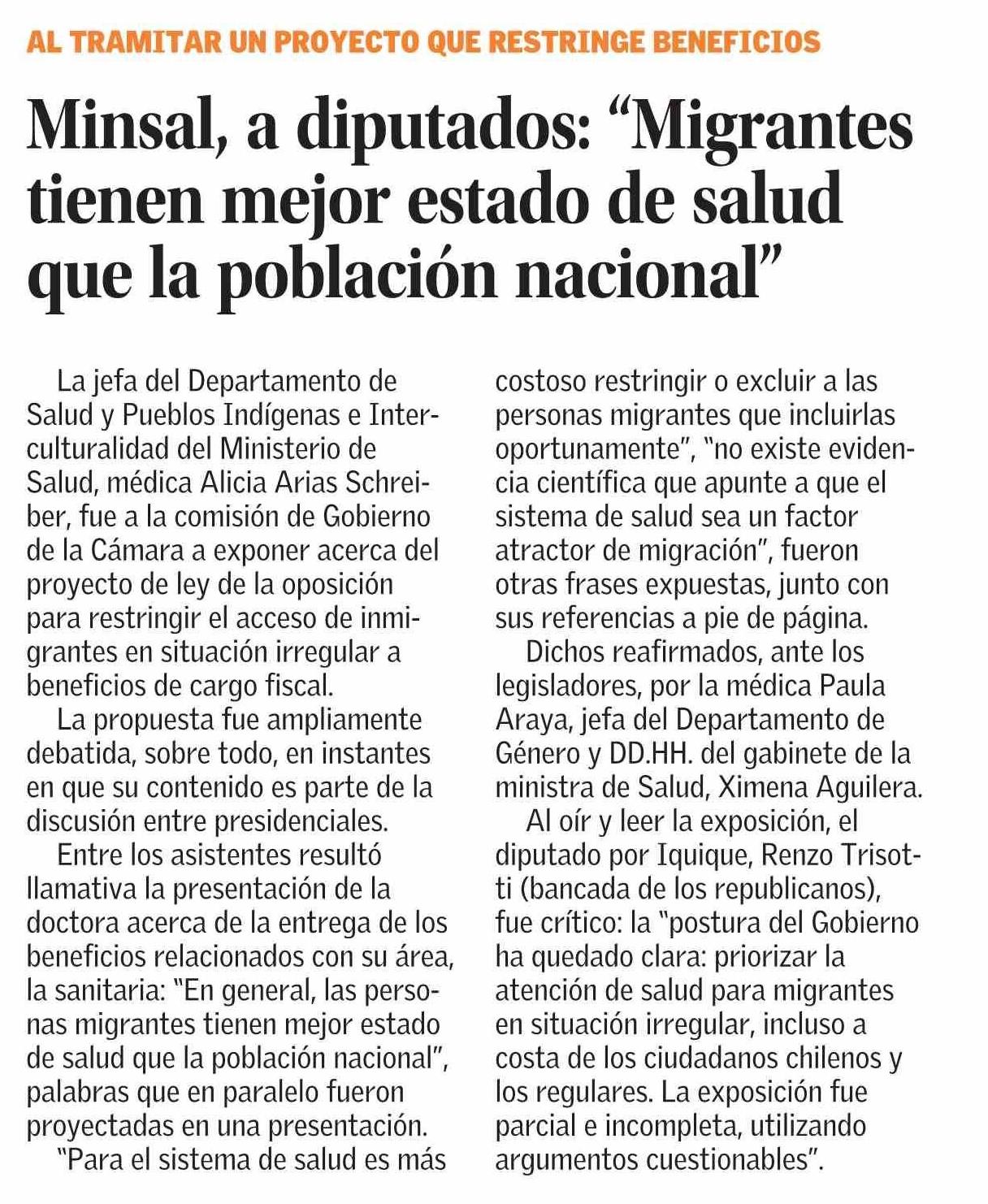 Minsal, a diputados: "Migrantes tienen mejor estado de salud que la población nacional" 06-06-2025 El Mercurio |