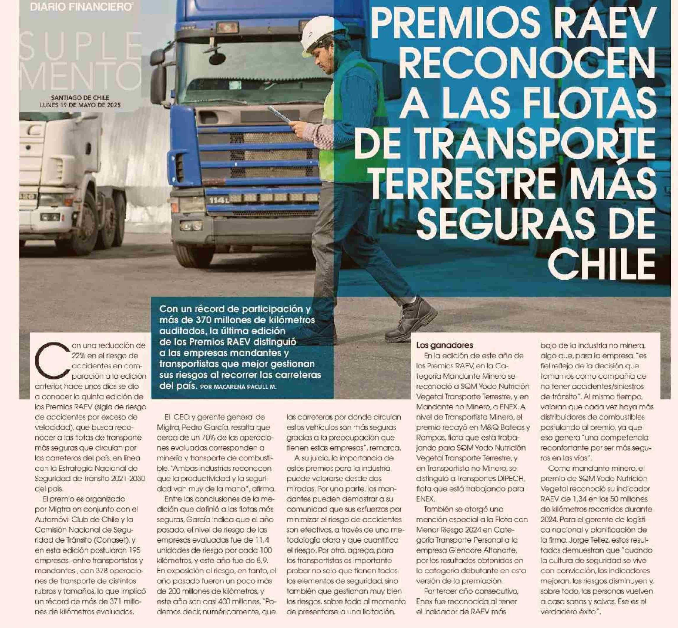 PREMIOS RAEV RECONOCEN A LAS FLOTAS DE TRANSPORTE TERRESTRE MAS SEGURAS DE CHILE 19-05-2025 Diario Financiero |