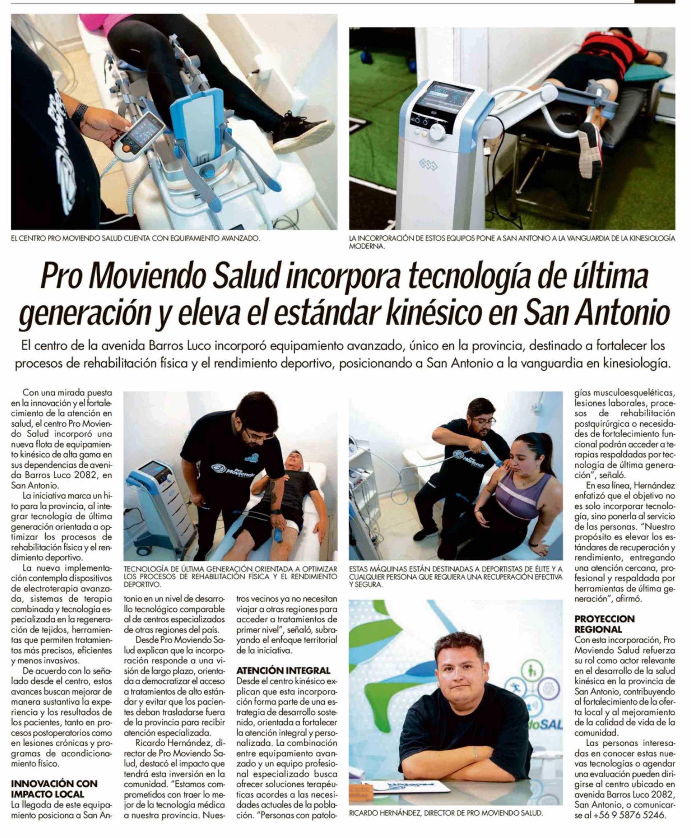| Título: | Pro Moviendo Salud incorpora tecnología de última generación y eleva el estándar kinésico en San Antonio |
