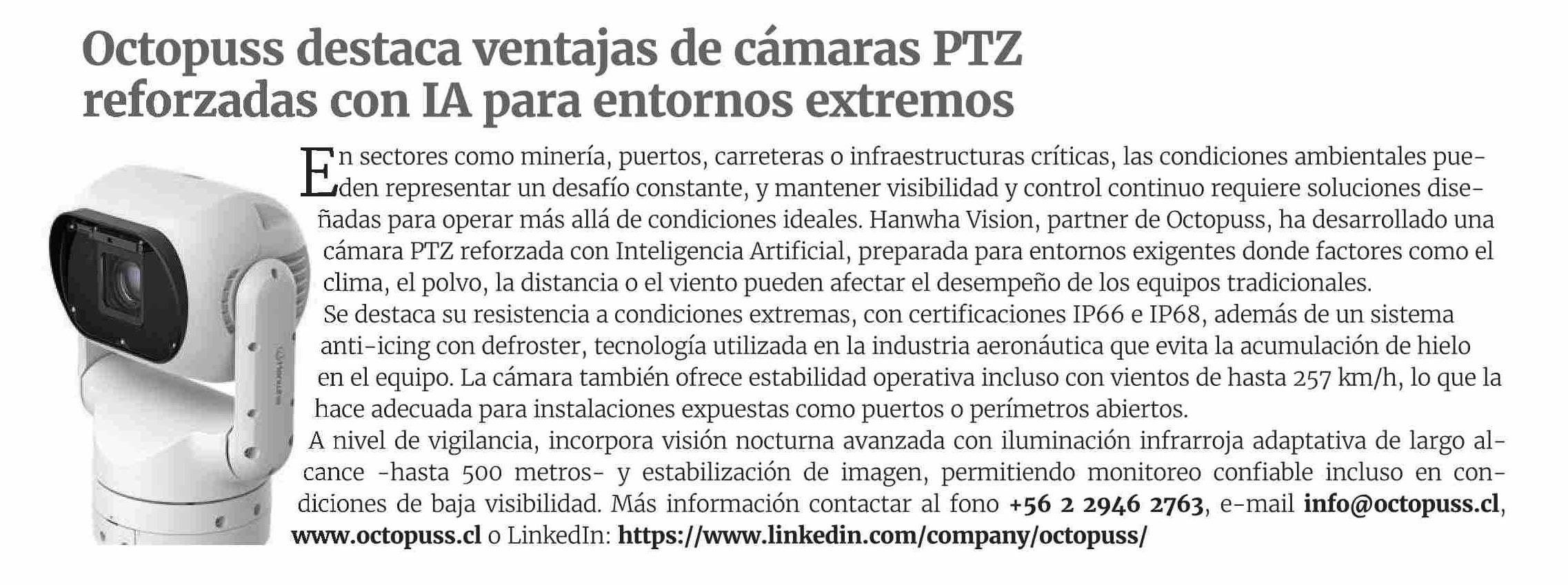 | Título: | Octopuss destaca ventajas de cámaras VEZ reforzadas con iA para entornos extremos |