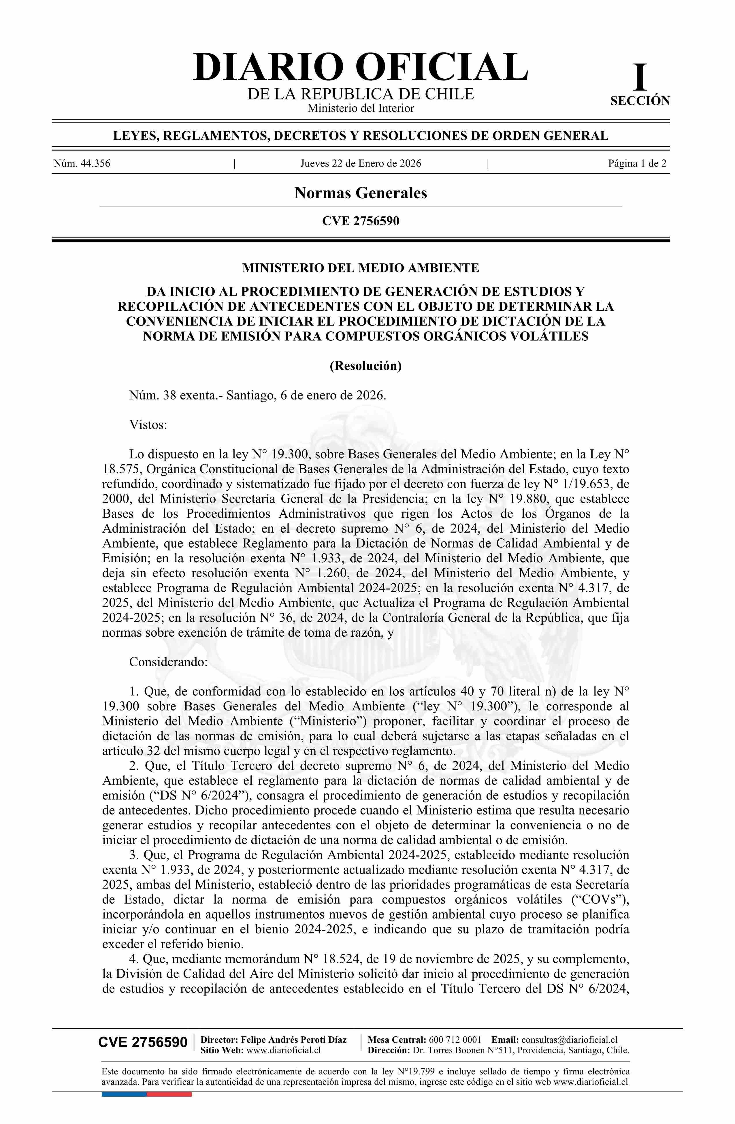 Título: Resolución exenta número 38, de 2026.- Da inicio al procedimiento de generación de estudios y recopilación de antecedentes con el objeto de determinar la conveniencia de iniciar el procedimiento de dictación de la norma de emisión para compuestos orgánicos volátiles