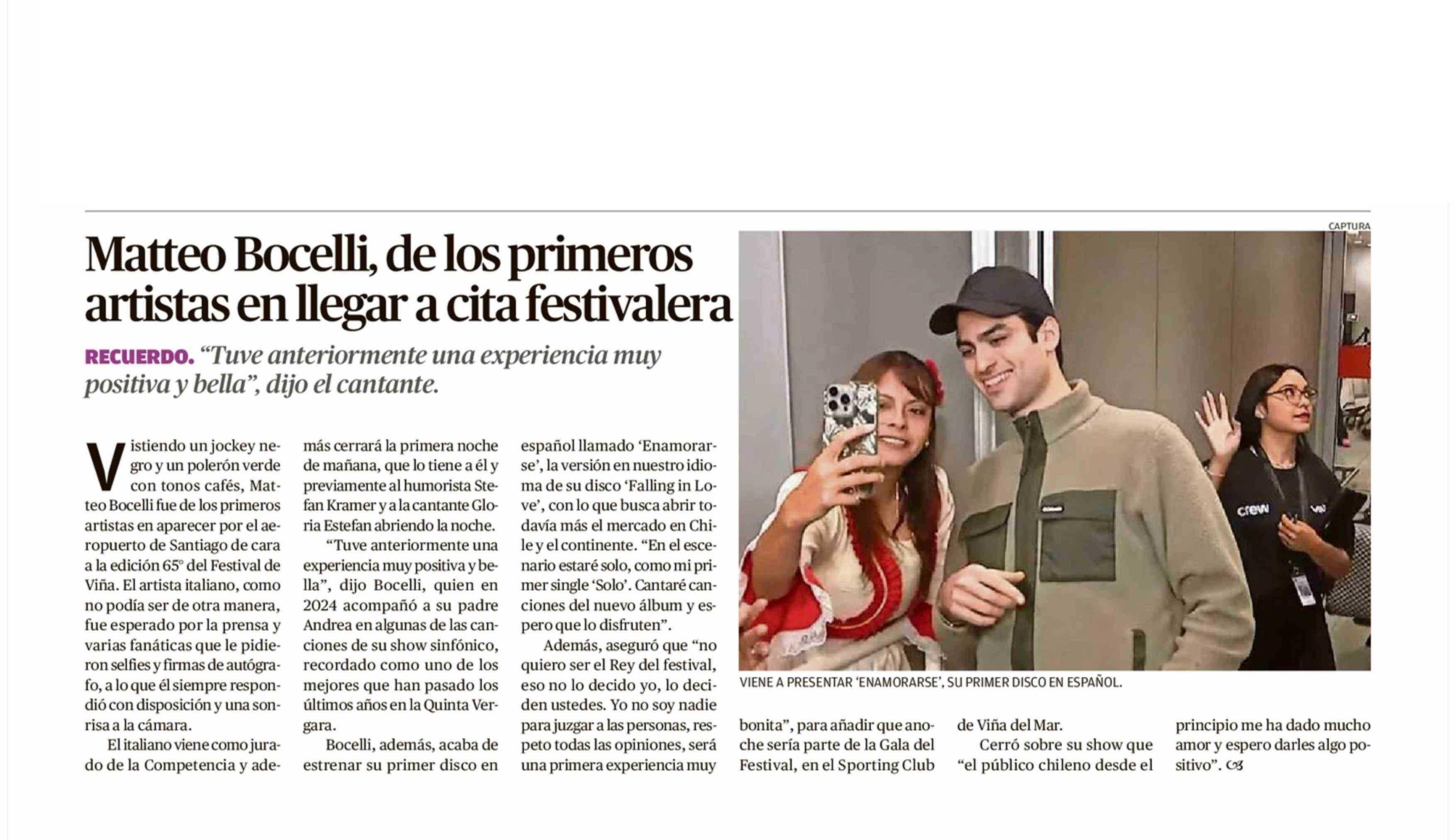 Matteo Bocelli, de los primeros artistas en llegar a cita festivalera 21-02-2026 Crónica de Chillán |