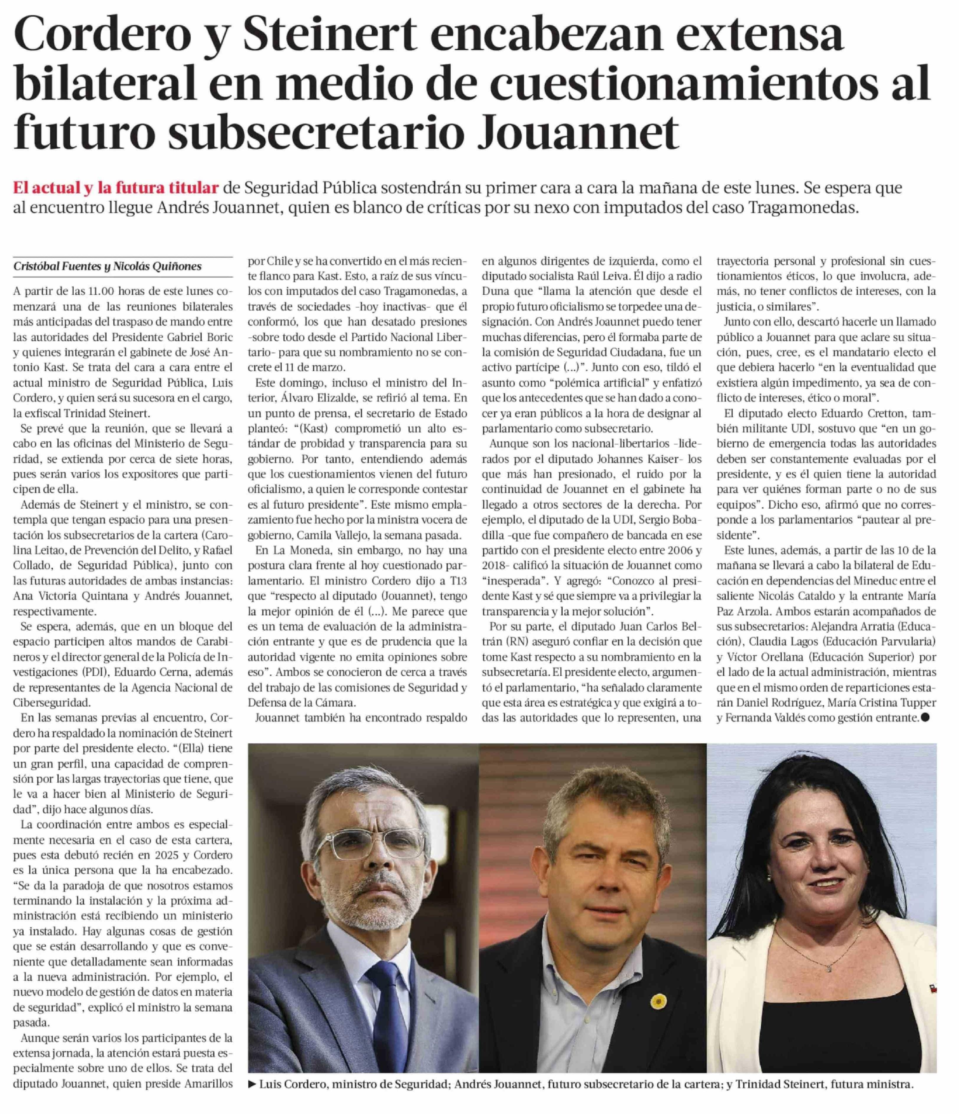 Título: Cordero y Steinert encabezan extensa bilateral en medio de cuestionamientos al futuro subsecretario Jouannet