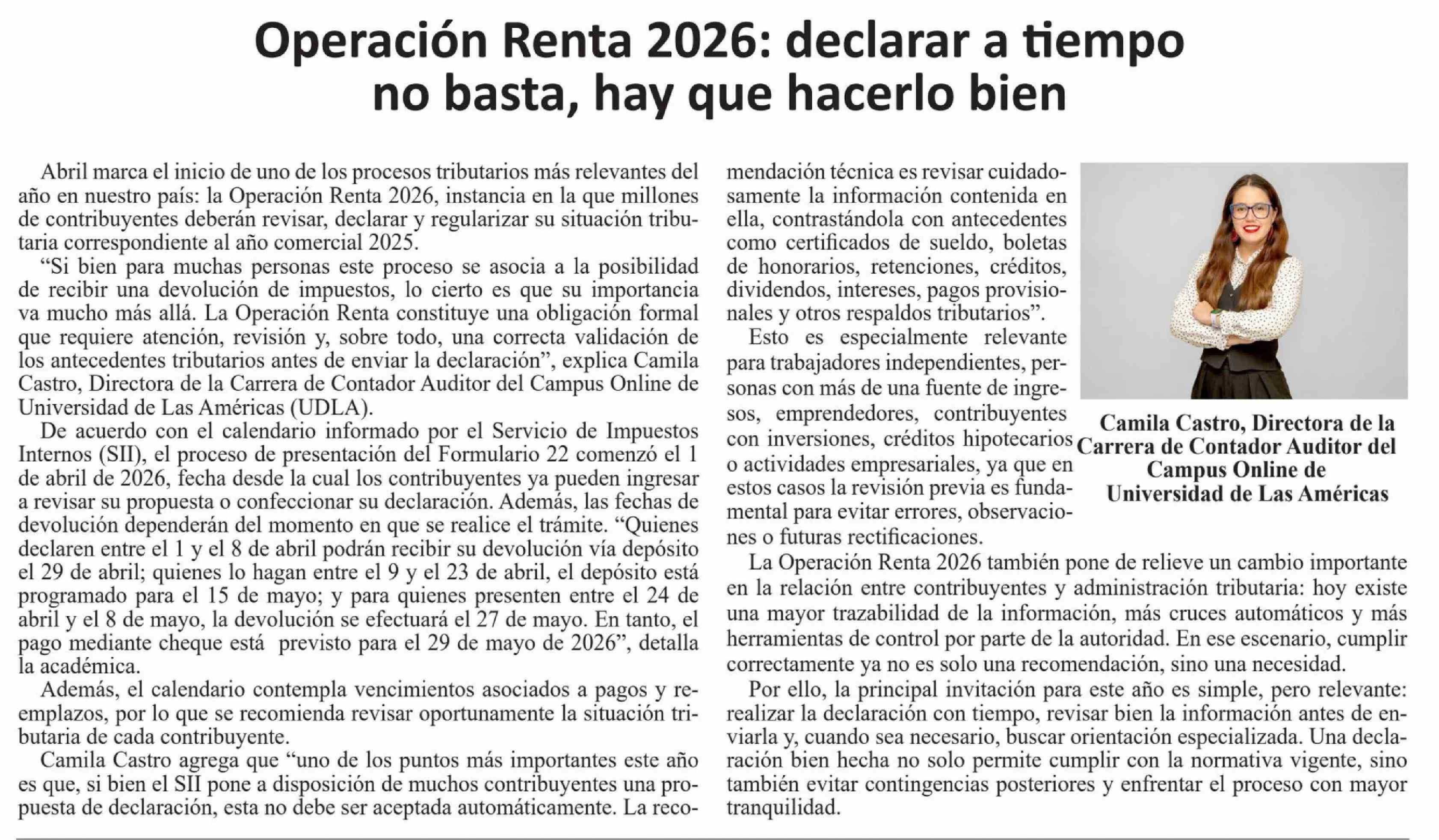 | Título: | Columnas de Opinión: Operación Renta 2026: declarar a tiempo no basta, hay que hacerlo bien |