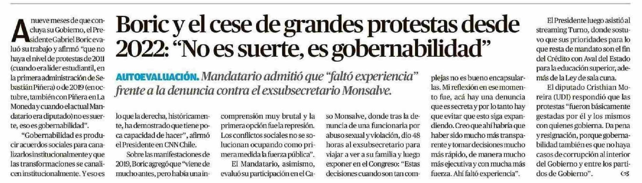 Título: Boric y el cese de grandes protestas desde 2022: “No es suerte, es gobernabilidad”