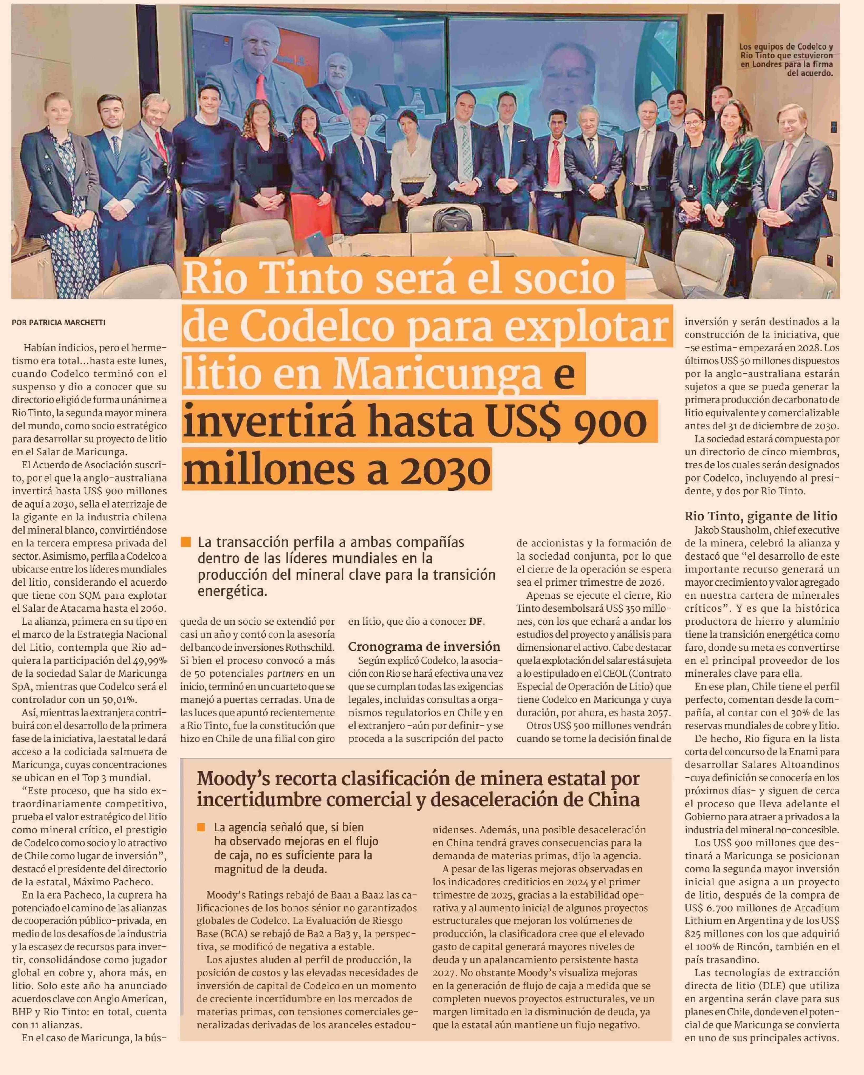 Rio Tinto será el socio de Codelco para explotar litio en Maricunga e invertirá hasta USS 900 millones a 2030 20-05-2025 Diario Financiero |