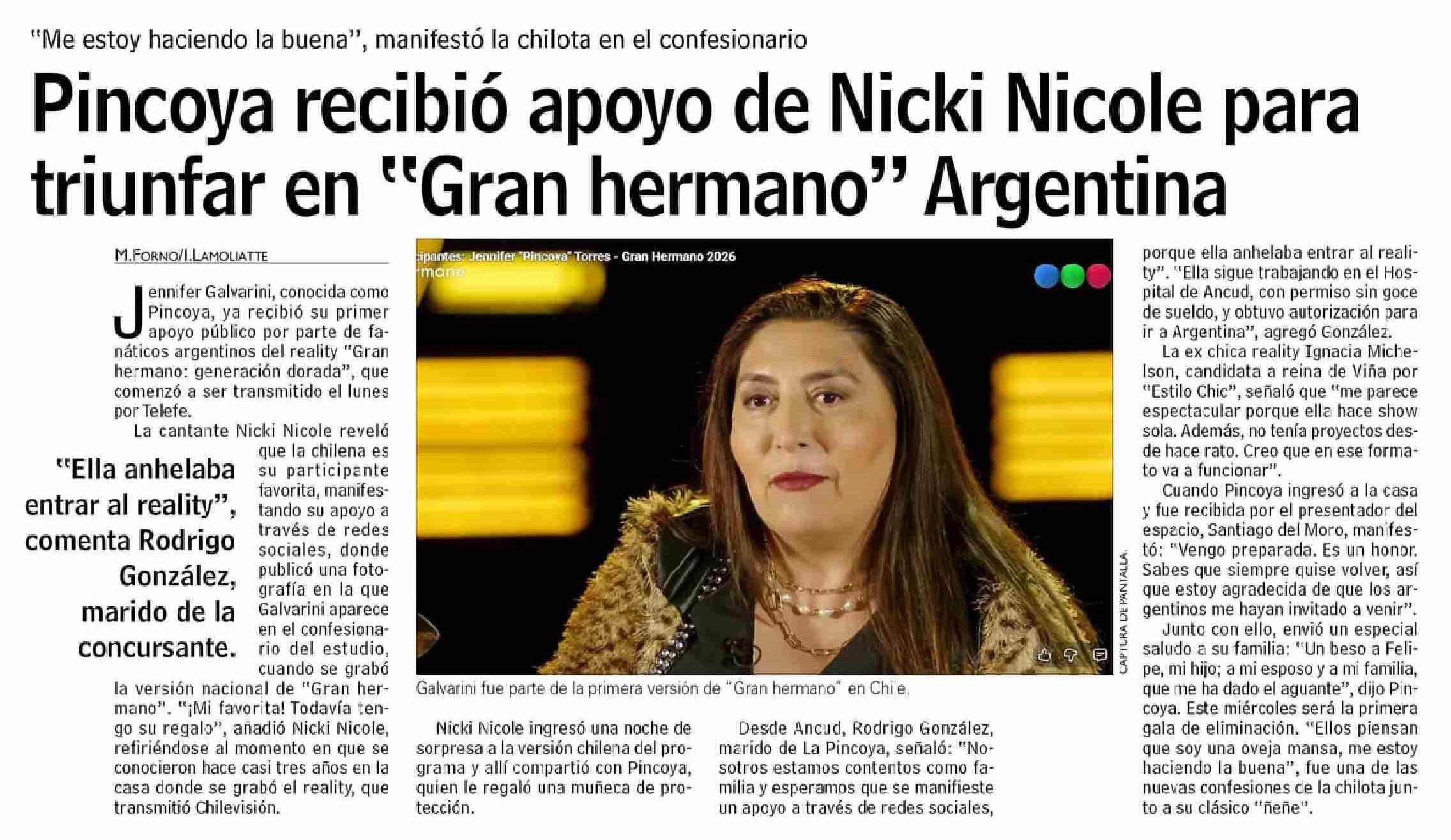 Pincoya recibió apoyo de Nicki Nicole para triunfar en "Gran hermano" Argentina 26-02-2026 Las Últimas Noticias |