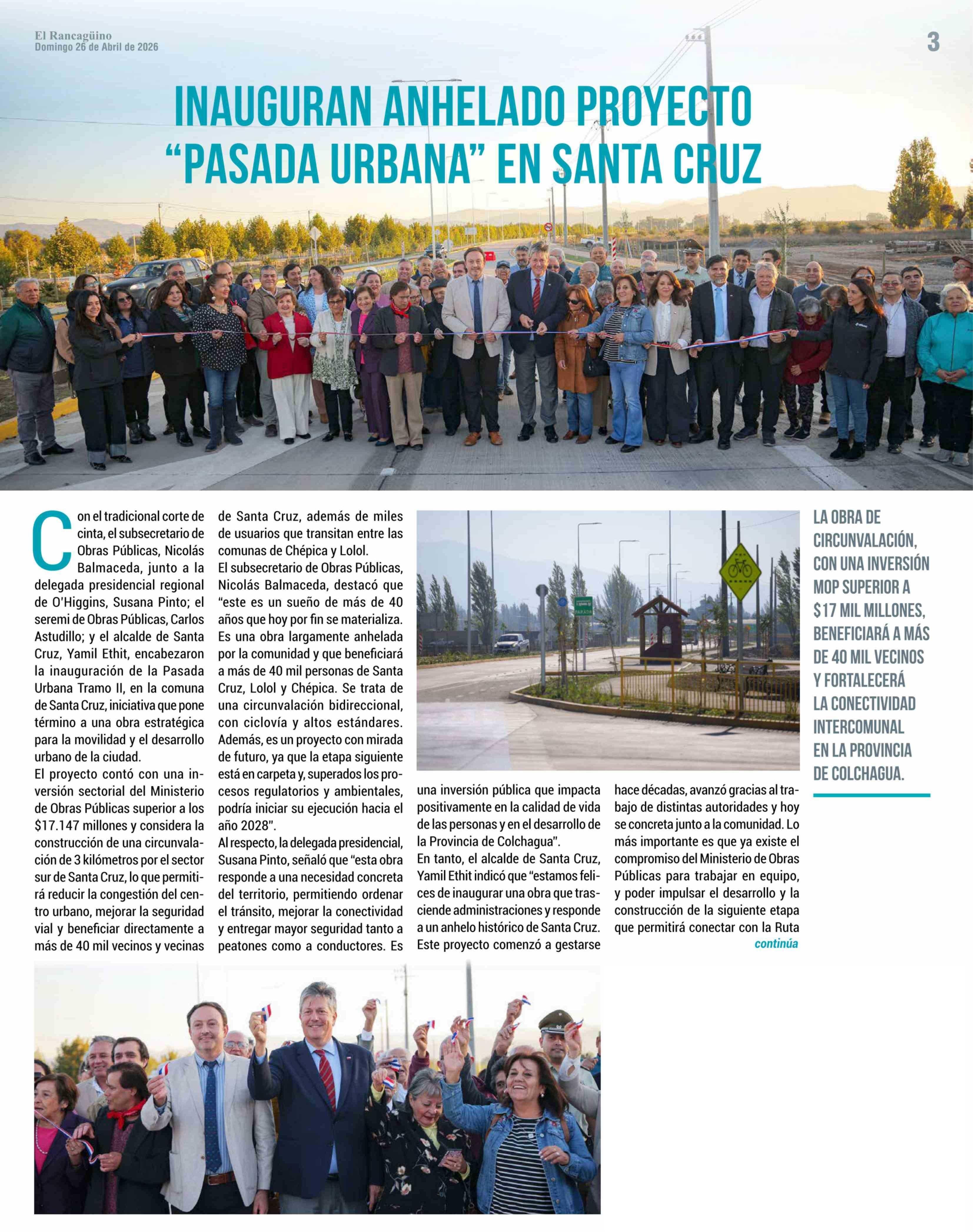 INAUGURAN ANHELADO PROYECTO "PASADA URBANA" EN SANTA CRUZ 26-04-2026 El Rancagüino |