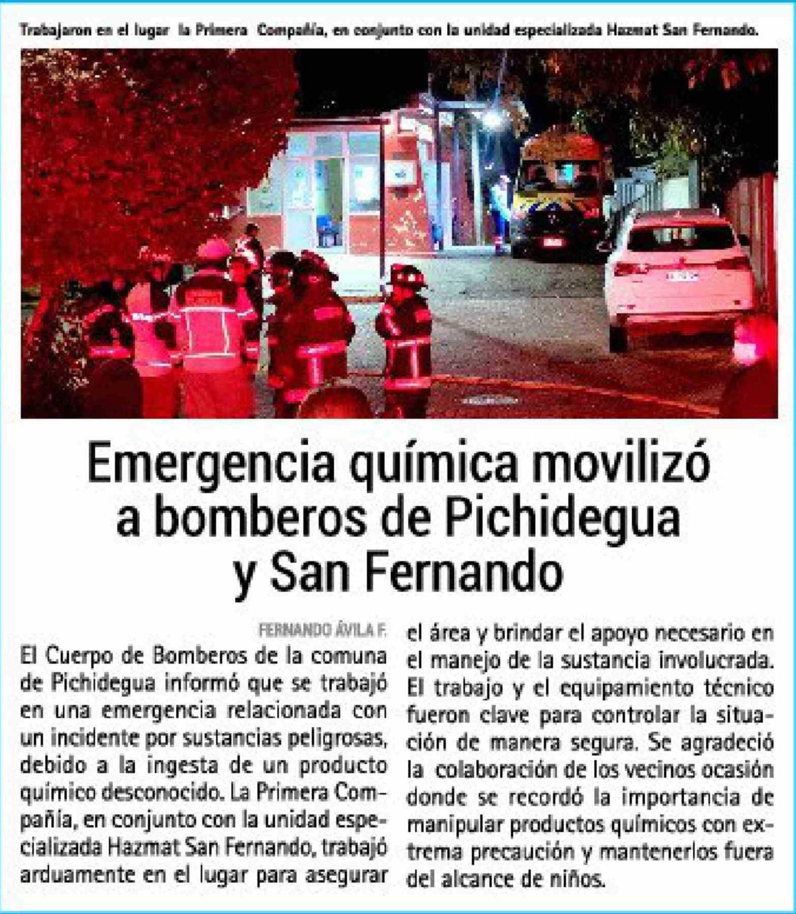 | Título: | Emergencia química movilizó a bomberos de Pichidegua y San Fernando |