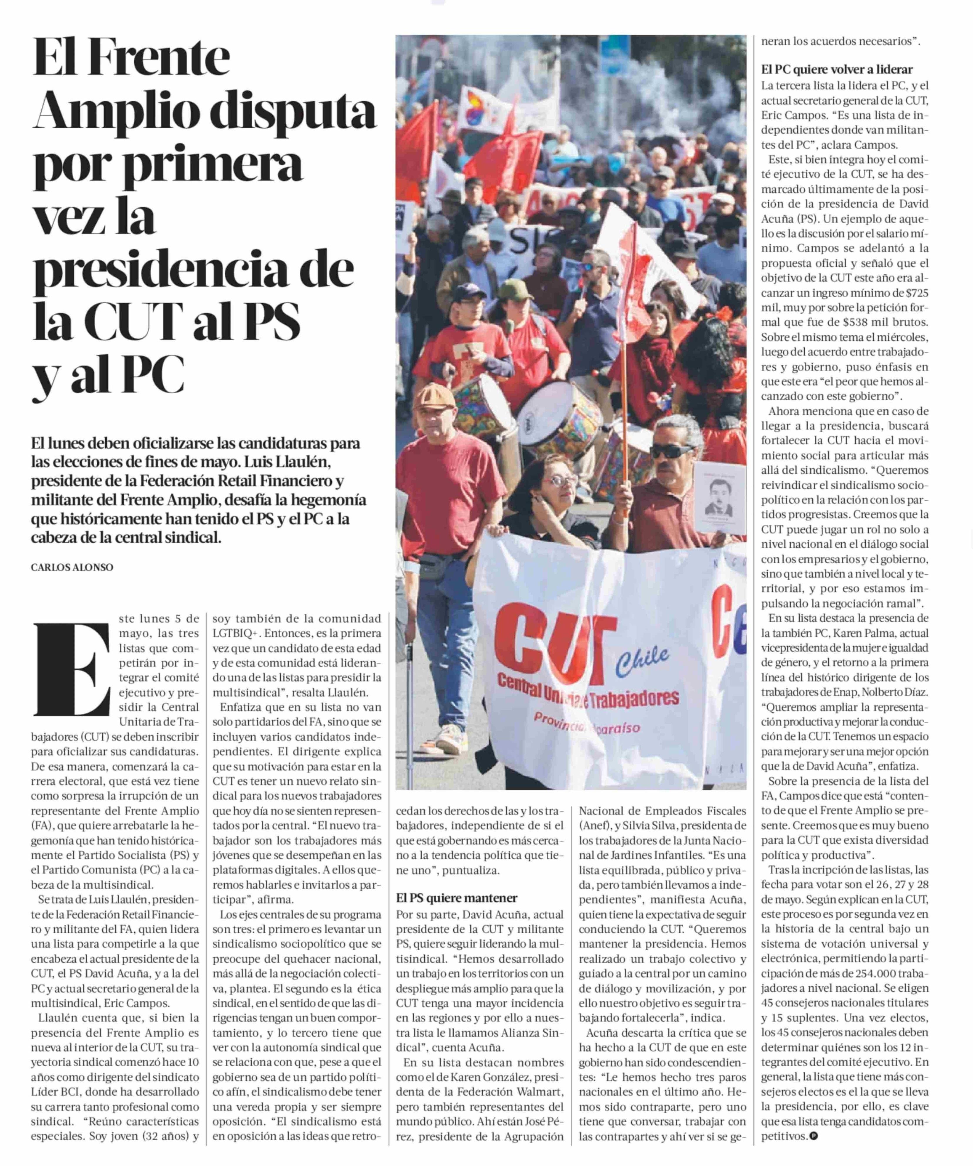 El Frente Amplio disputa por primera vez la presidencia de la CUT al PS y al PC 03-05-2025 La Tercera |