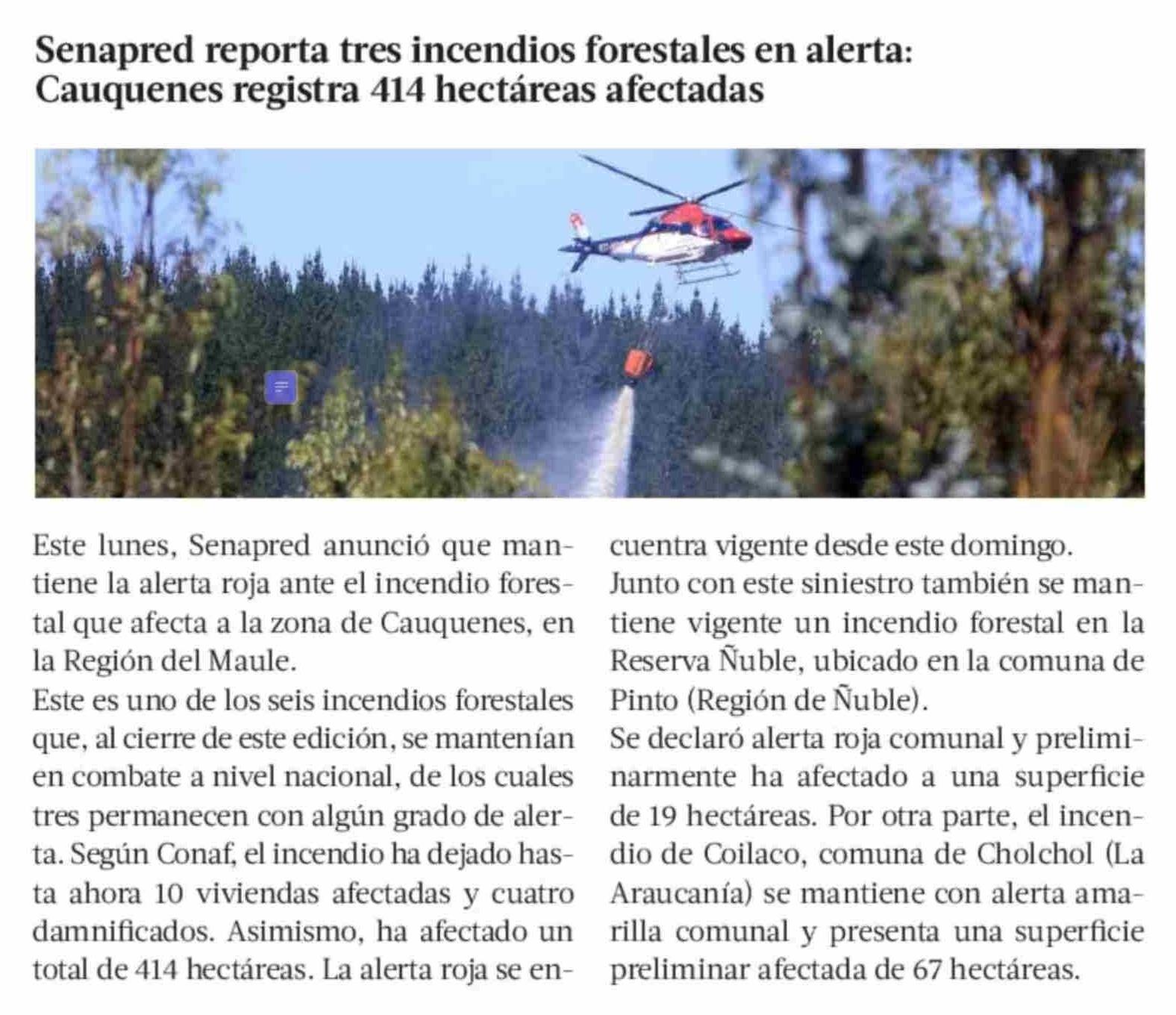 Senapred reporta tres incendios forestales en alerta: Cauquenes registra 414 hectáreas afectadas 13-01-2026 La Tercera |