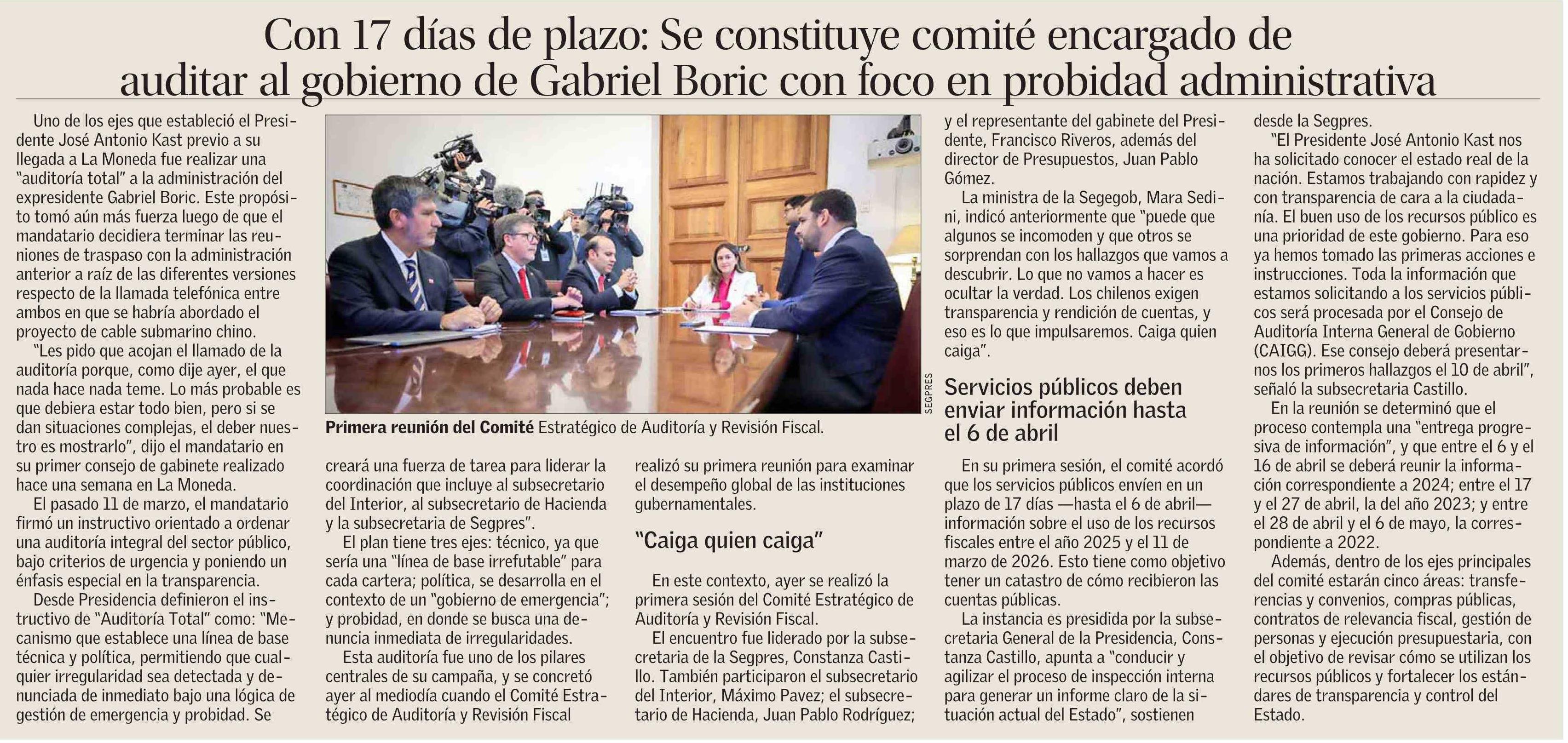 Con 17 días de plazo: Se constituye comité encargado de auditar al gobierno de Gabriel Boric con foco en probidad administrativa 21-03-2026 El Mercurio |