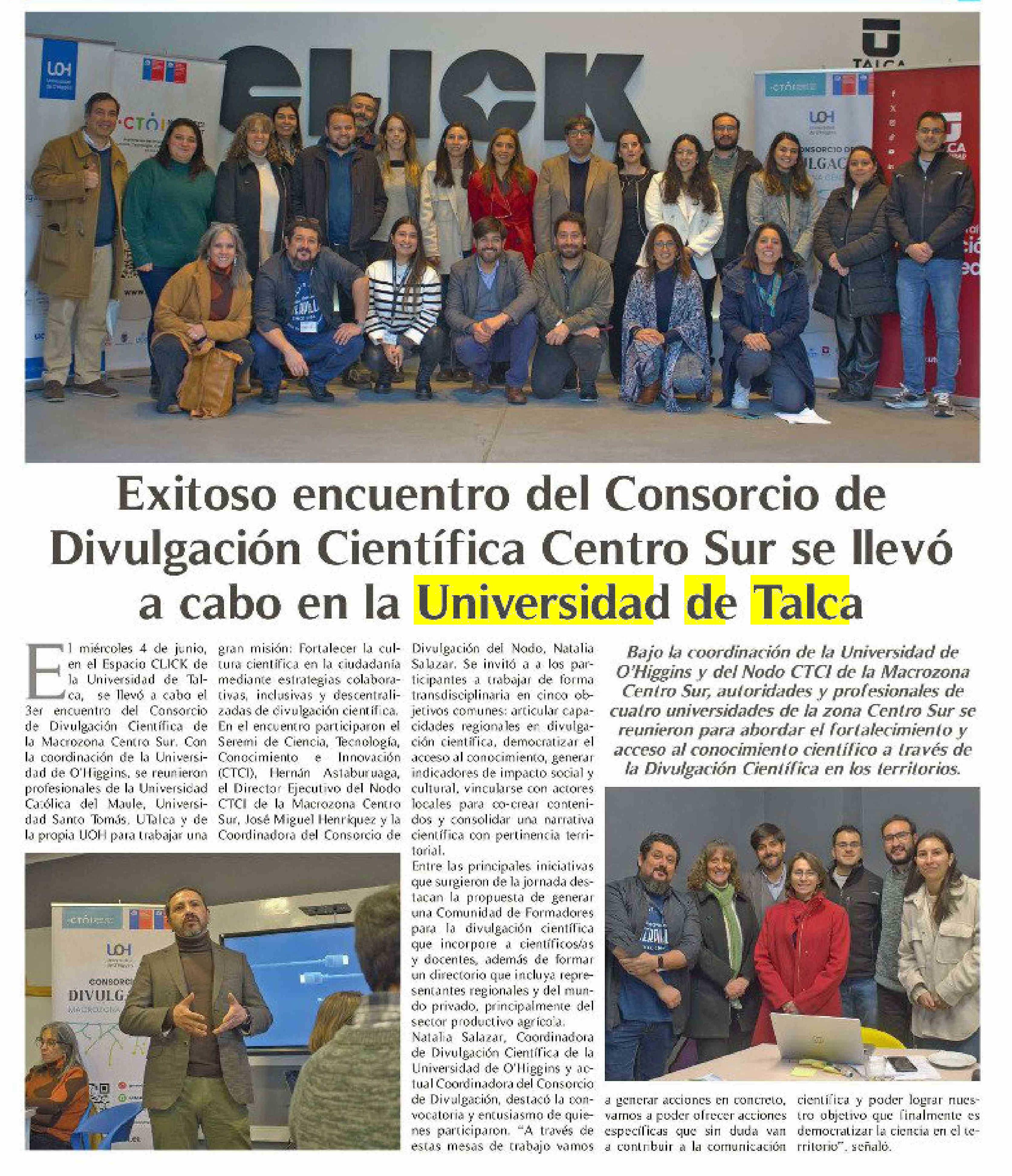 Exitoso encuentro del Consorcio de Divulgación Científica Centro Sur se llevó a cabo en la Universidad de Talca 10-06-2025 El Rancagüino |