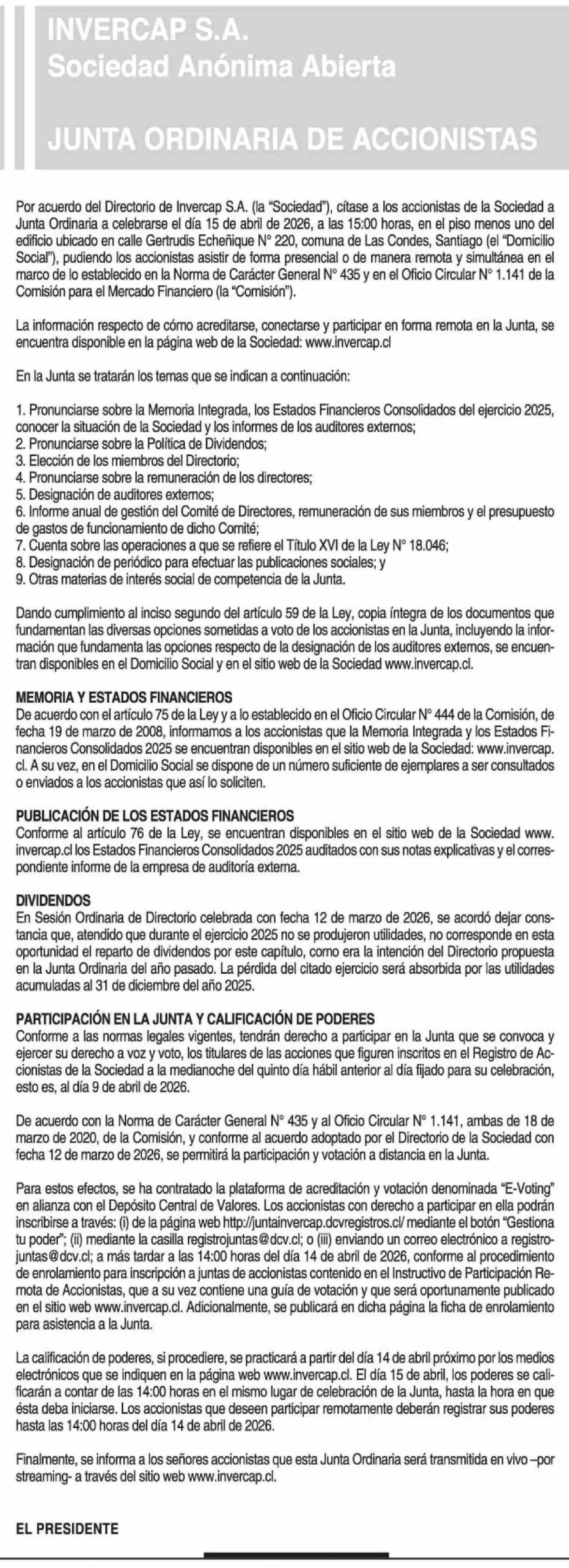 Extractos: INVERCAP S.A. Sociedad Anónima Abierta 27-03-2026 La Tercera |