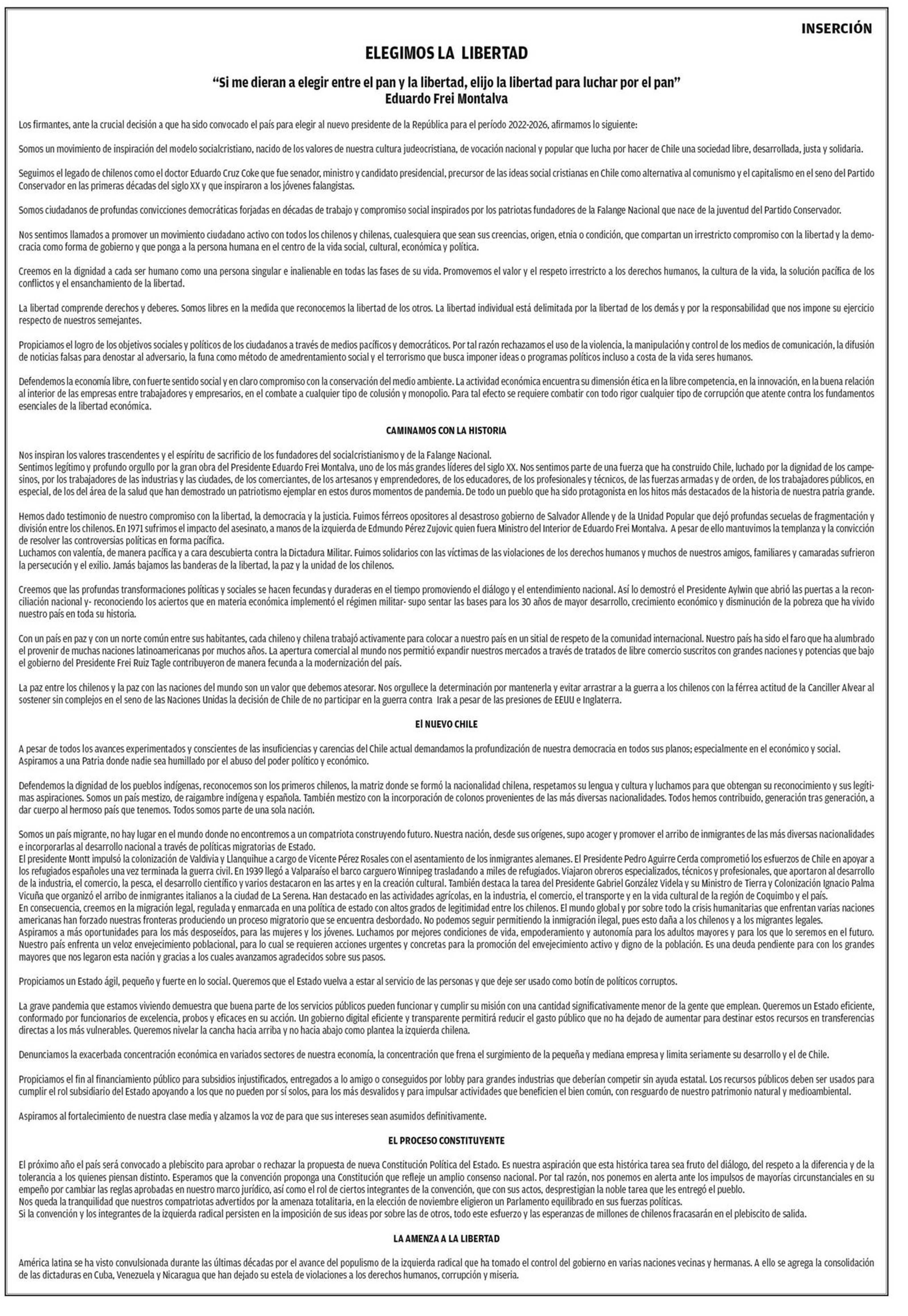 Título: ELEGIMOS LA LIBERTAD “Si me dieran a elegir entre el pan y la libertad, elijo la libertad para luchar por el pan” Eduardo Frei Montalva